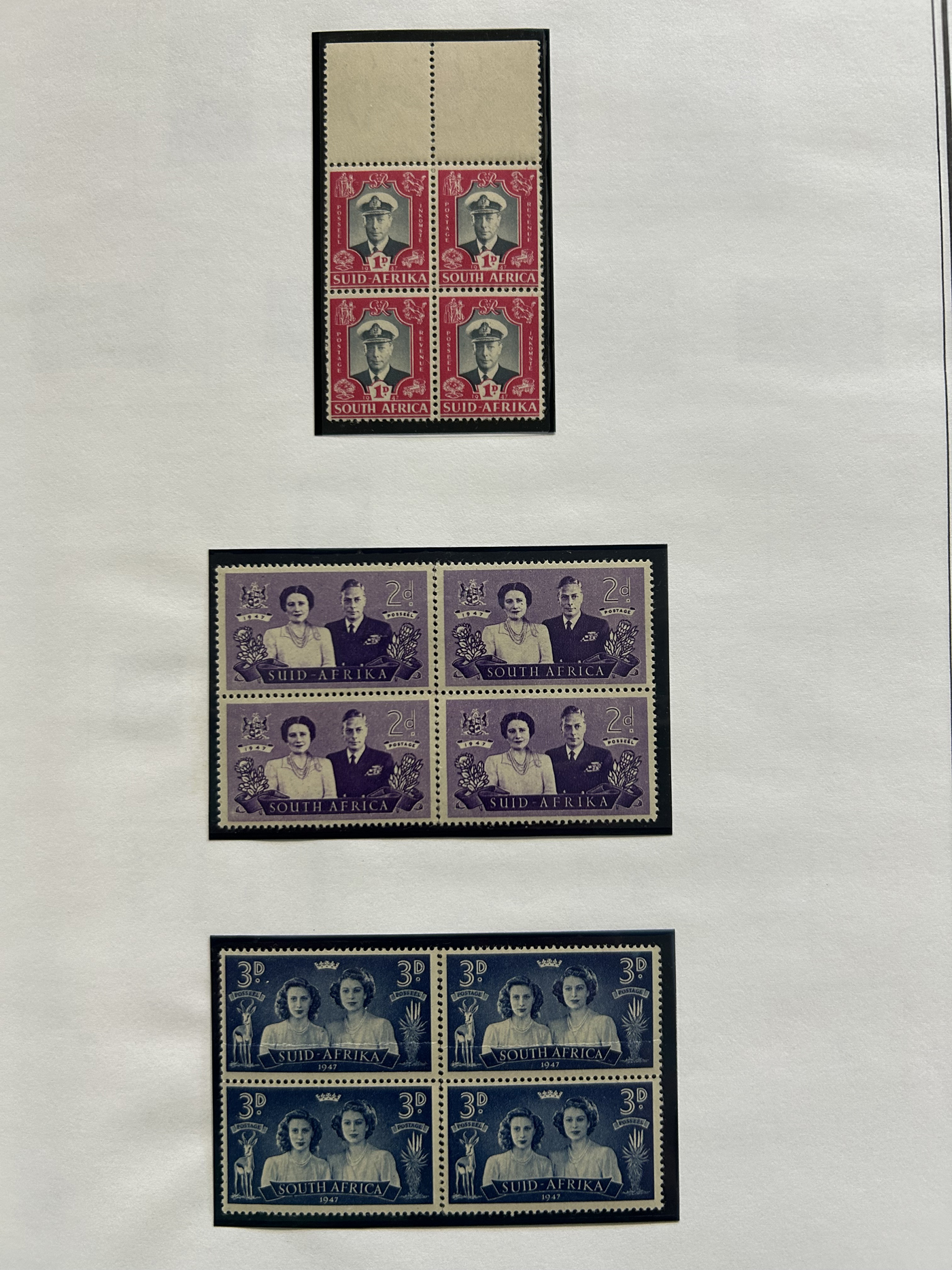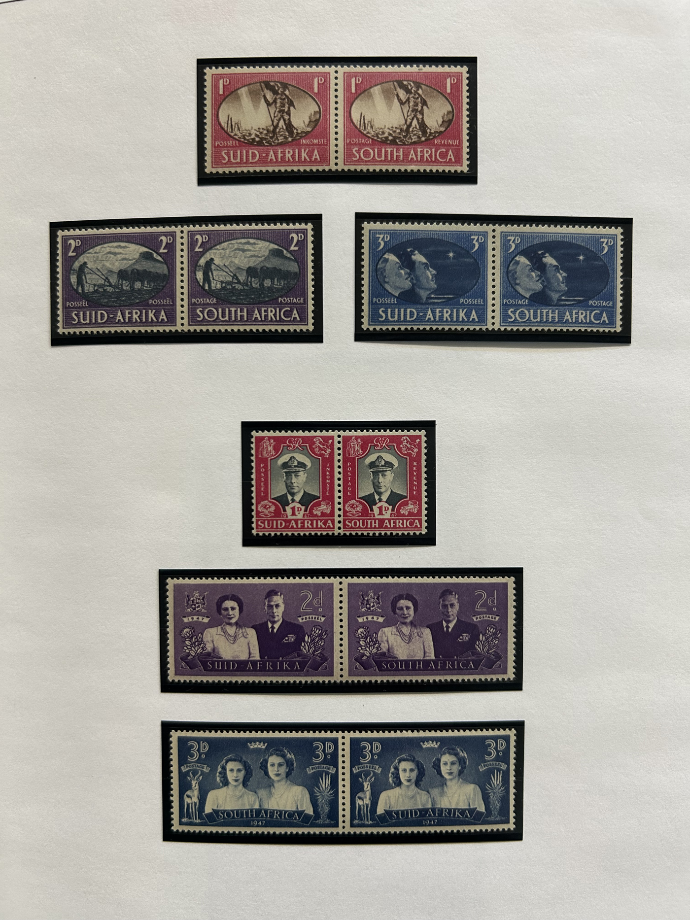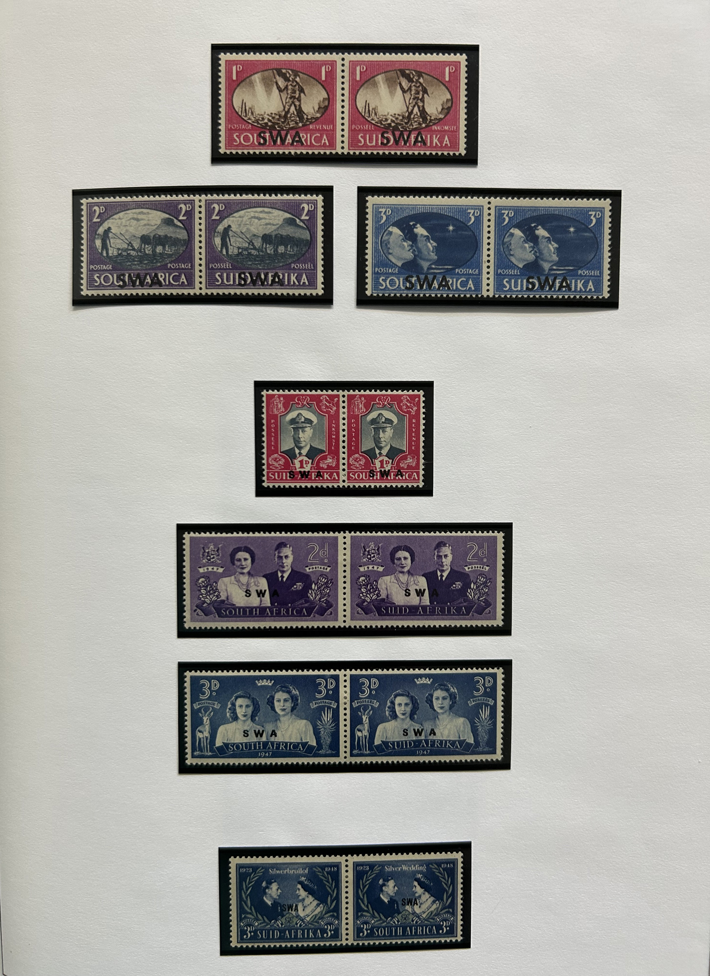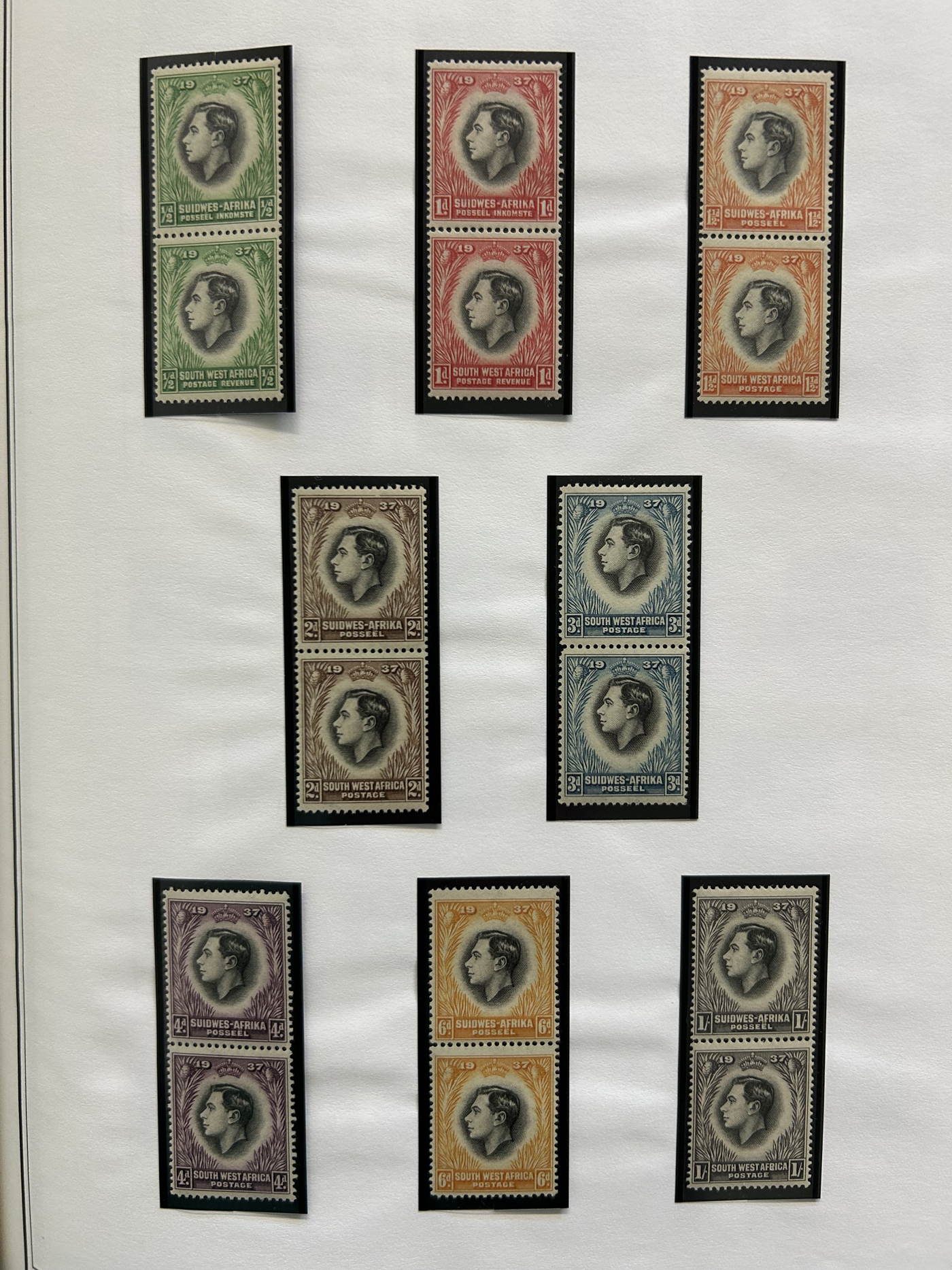 1657 og/nh   imageSmall Group of Early Mint South African Items, starting with four different mint never hinged 6d Orange Tree bilingual pairs, including shades, a pair with center arrow and one with plate inscription, followed by three different blocks of the 1d van Riebeek's Ship issue, including two plate number blocks of six (cylinder 6A and 6B, one stamp is hinged) and a plate number block of 12 (two stamps are lightly hinged). Then we have a mint coil strip of 6 each of the ½d and the 1d (Scott 98, 99, both never hinged), and a lightly hinged mint corner plate inscription block of Scott #s 62 and 63. Also includes three different mint hinged ½d Springbock pairs, one without overprint (South Africa), one overprinted S.W.A. and one overprinted South West Africa in two sideways lines. An overall fresh and fine to very fine group. (Scan 1) (Scan 2) (All Scans)
