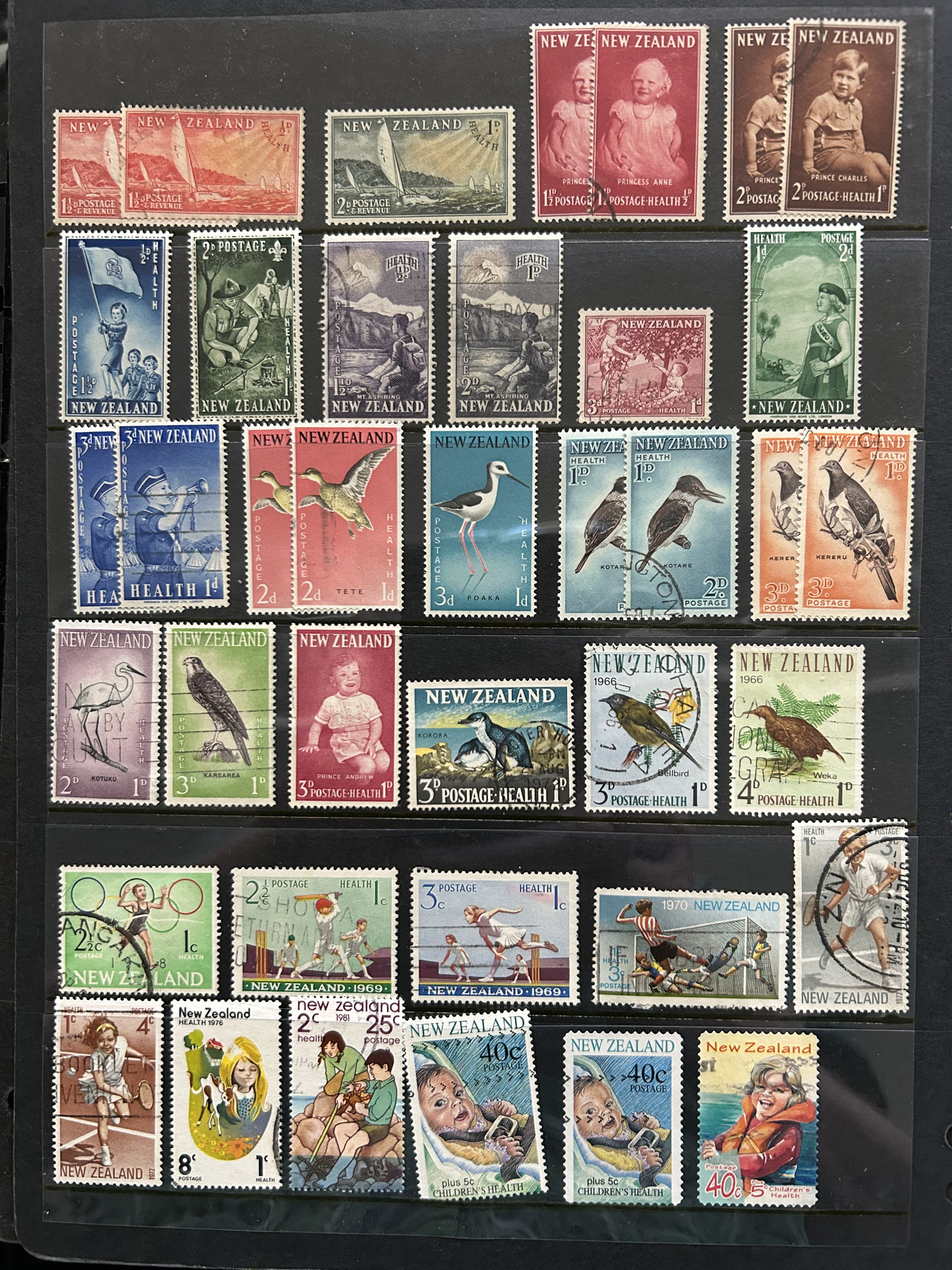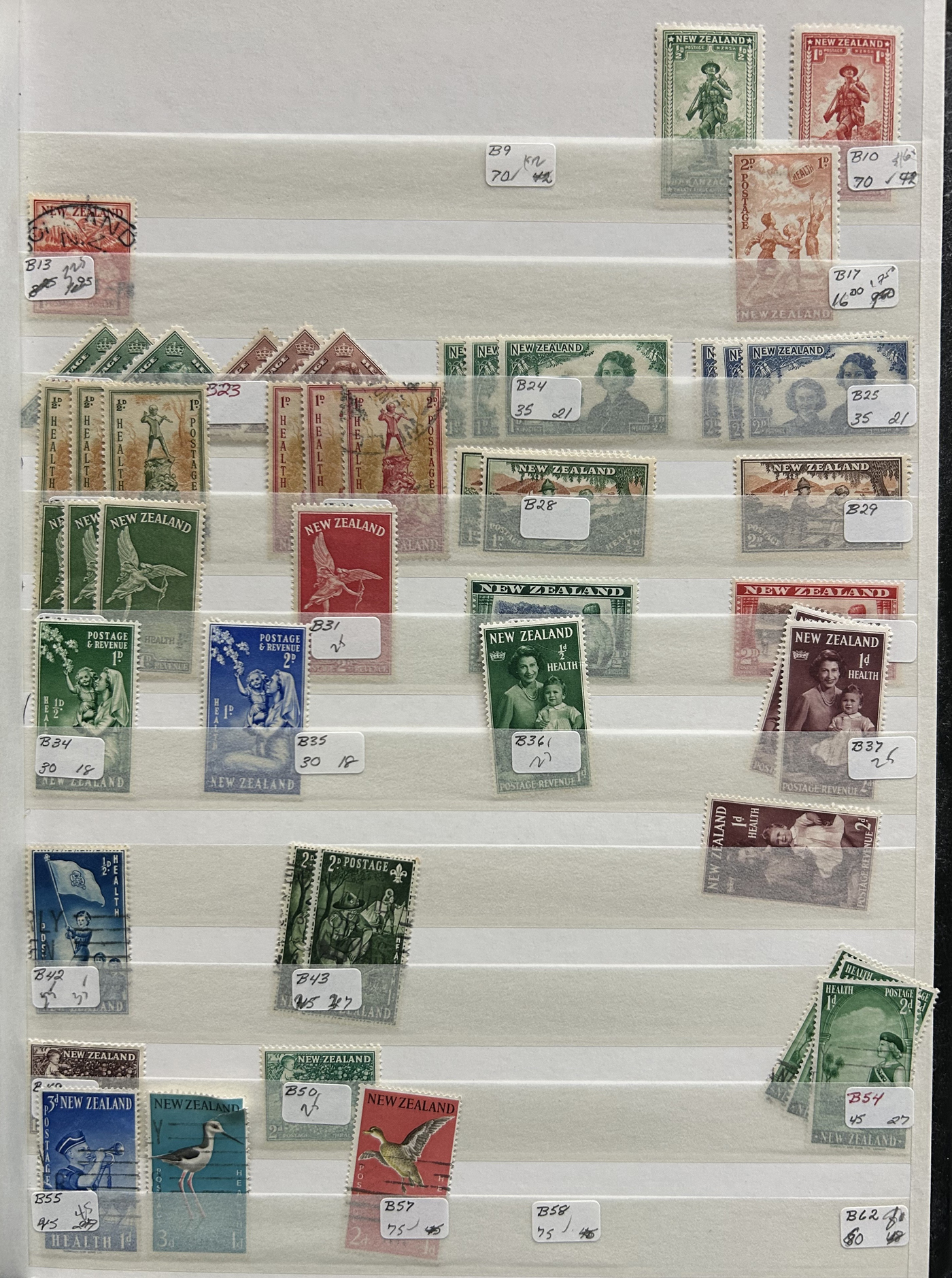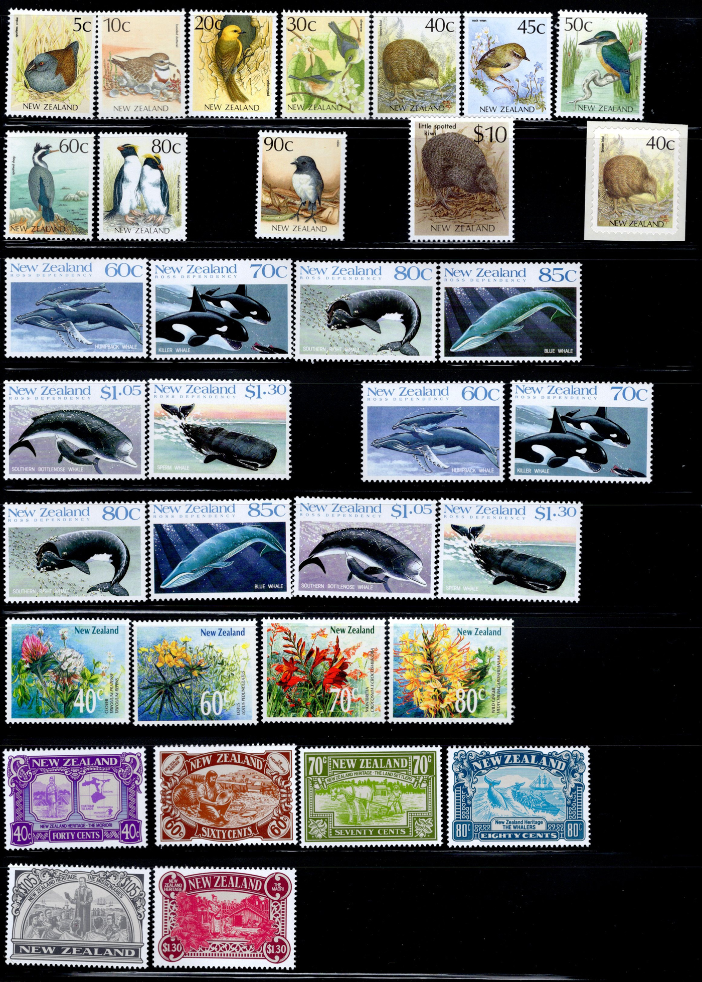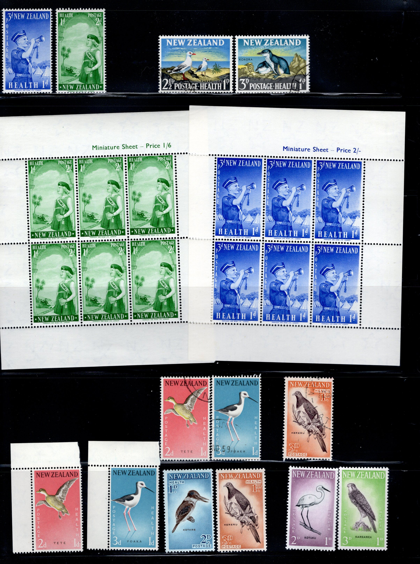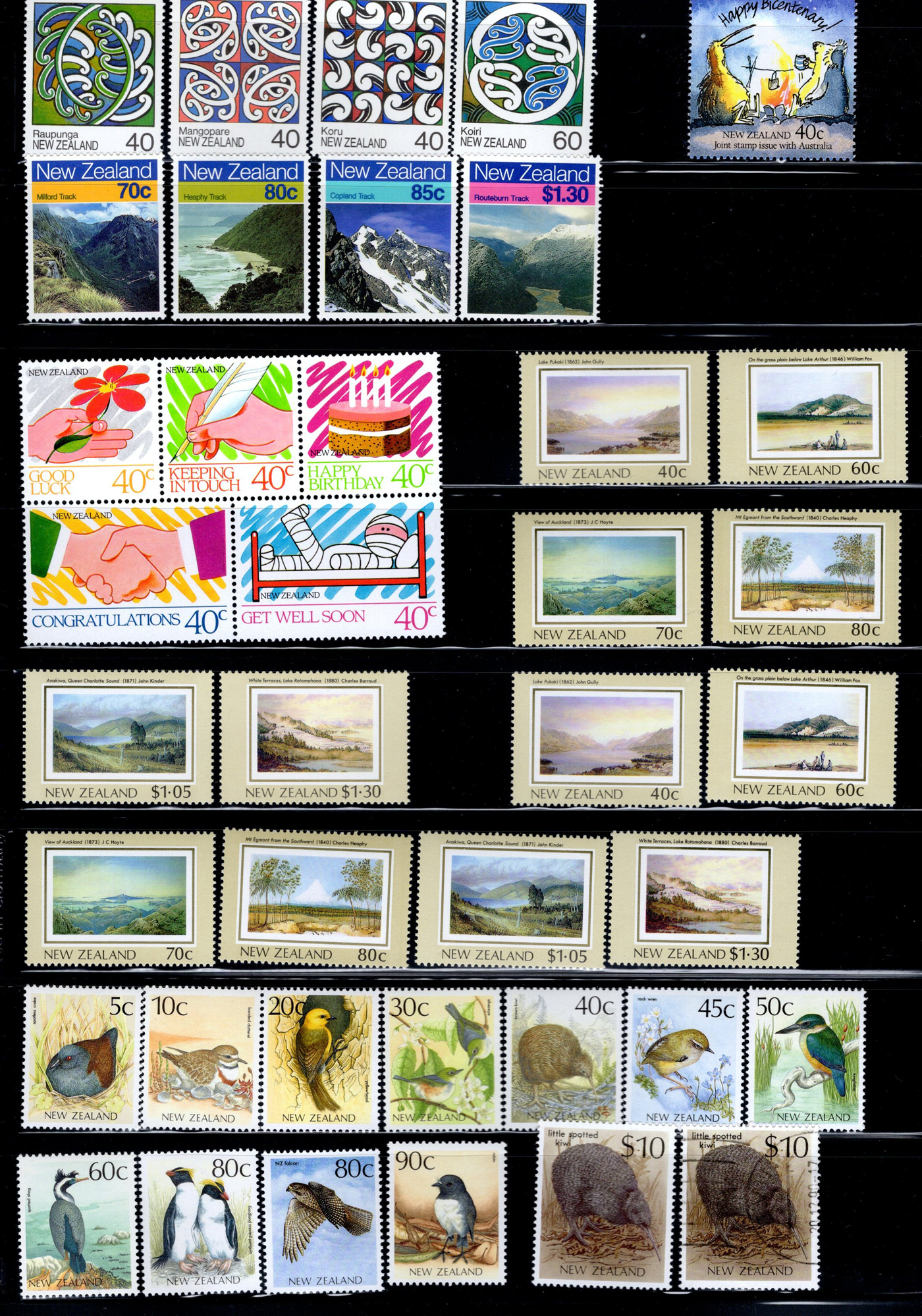 1642 O/og/nh   imageVarious Collections of Mint and Used New Zealand, includes a collection on 8 Minkus pages, a collection on 6 black stock sheets, some used stock in 4 manilla pages, a stockbook containing about 100 stamps, the best being a page of Health issues, a binder containing a mint collection in black mounts which appears close to complete for 1940 to 1988 period. Some sorting required, but all in all a good catalogue value here, and lots of useful material. See pics for a small idea. (Scan 1) (Scan 2) (Scan 3) (Scan 4) (Scan 5) (Scan 6) (Scan 7) (Scan 8) (Scan 9) (Scan 10) (Scan 11) (Scan 12) (Scan 13) (All Scans)