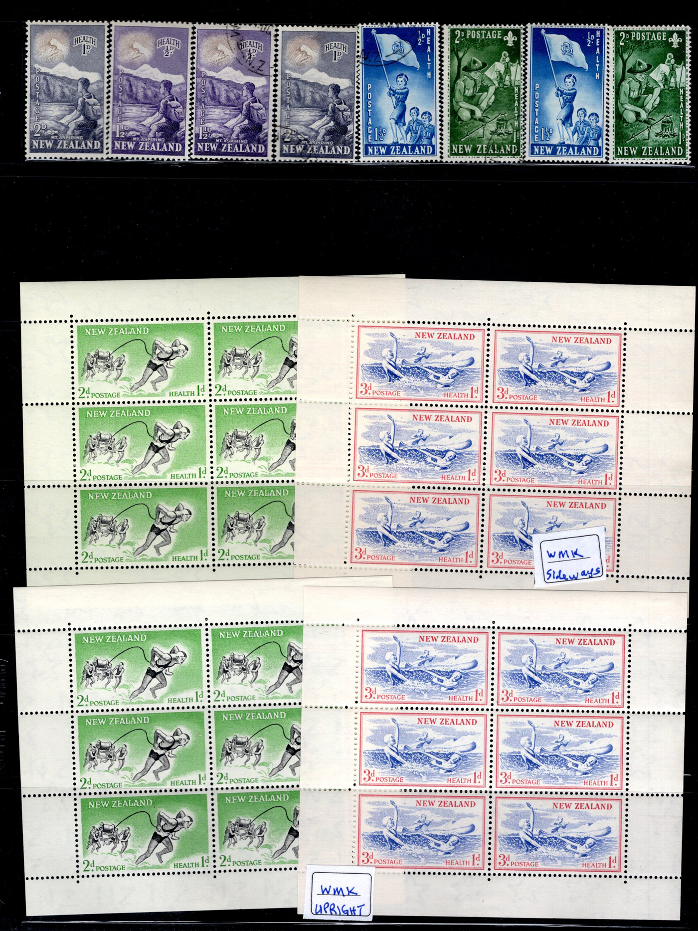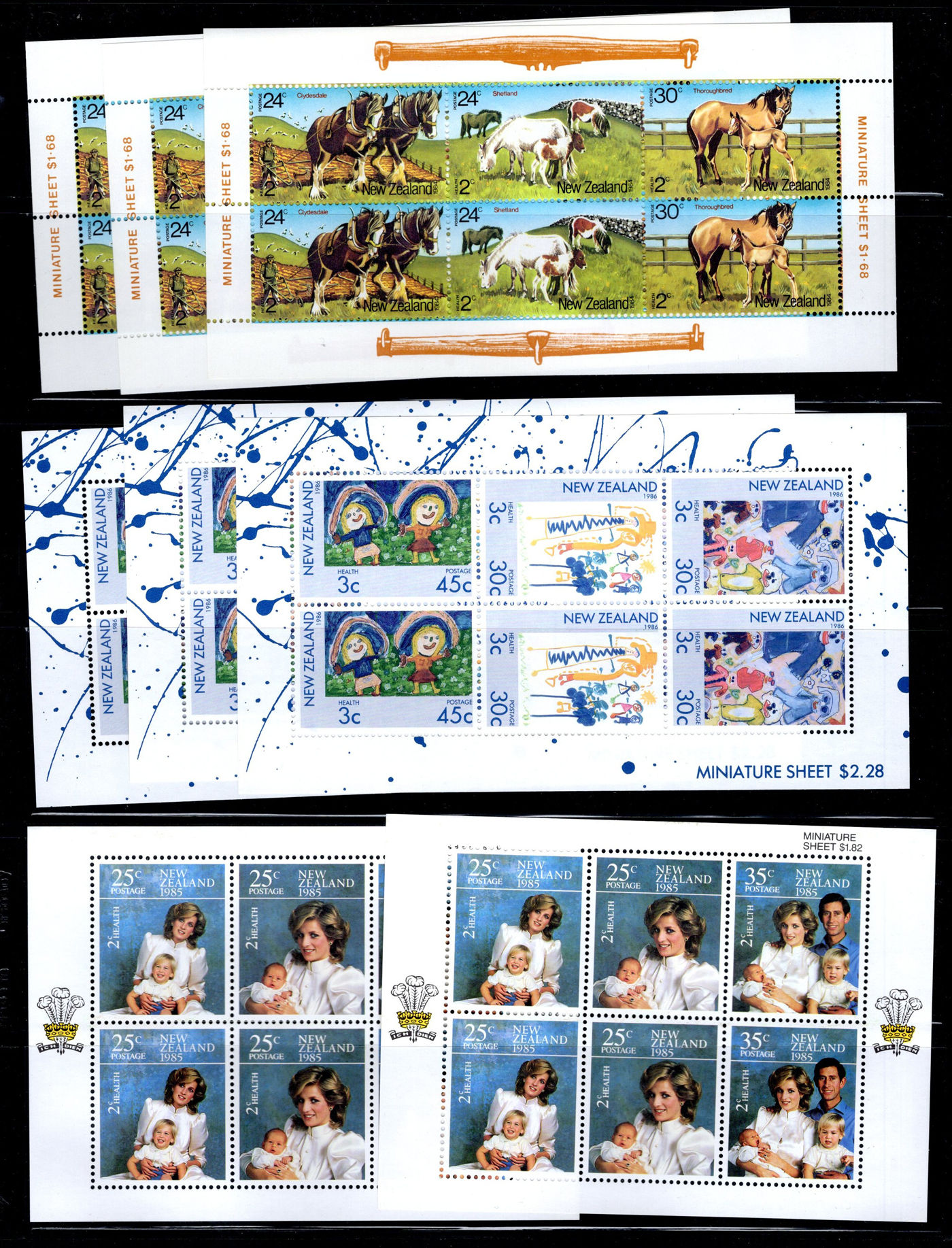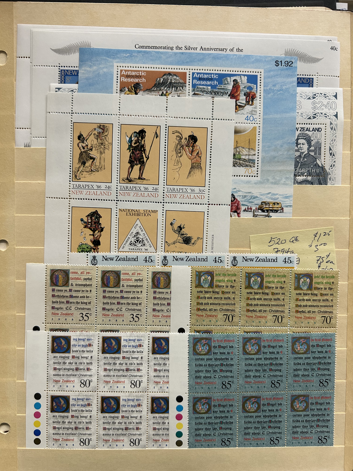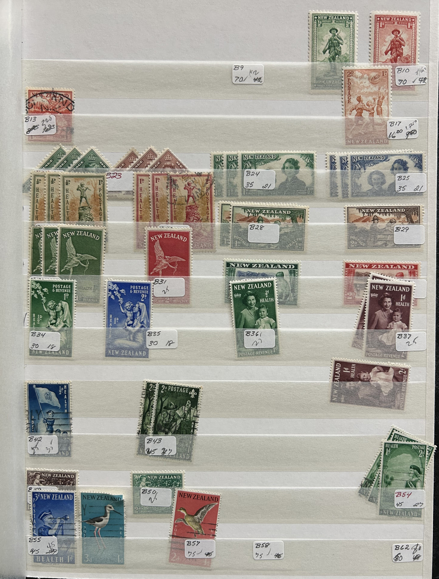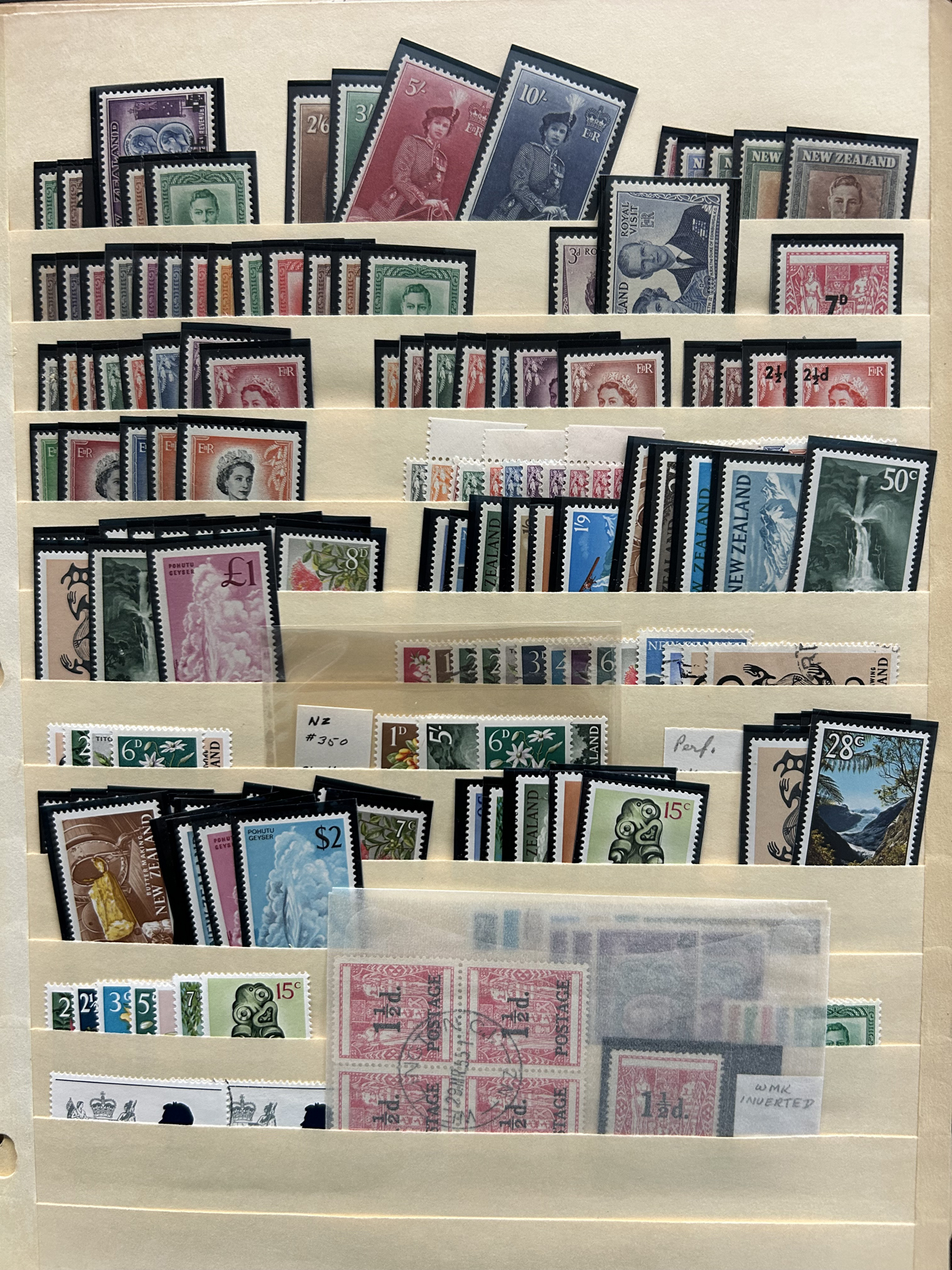1642 O/og/nh   imageVarious Collections of Mint and Used New Zealand, includes a collection on 8 Minkus pages, a collection on 6 black stock sheets, some used stock in 4 manilla pages, a stockbook containing about 100 stamps, the best being a page of Health issues, a binder containing a mint collection in black mounts which appears close to complete for 1940 to 1988 period. Some sorting required, but all in all a good catalogue value here, and lots of useful material. See pics for a small idea. (Scan 1) (Scan 2) (Scan 3) (Scan 4) (Scan 5) (Scan 6) (Scan 7) (Scan 8) (Scan 9) (Scan 10) (Scan 11) (Scan 12) (Scan 13) (All Scans)