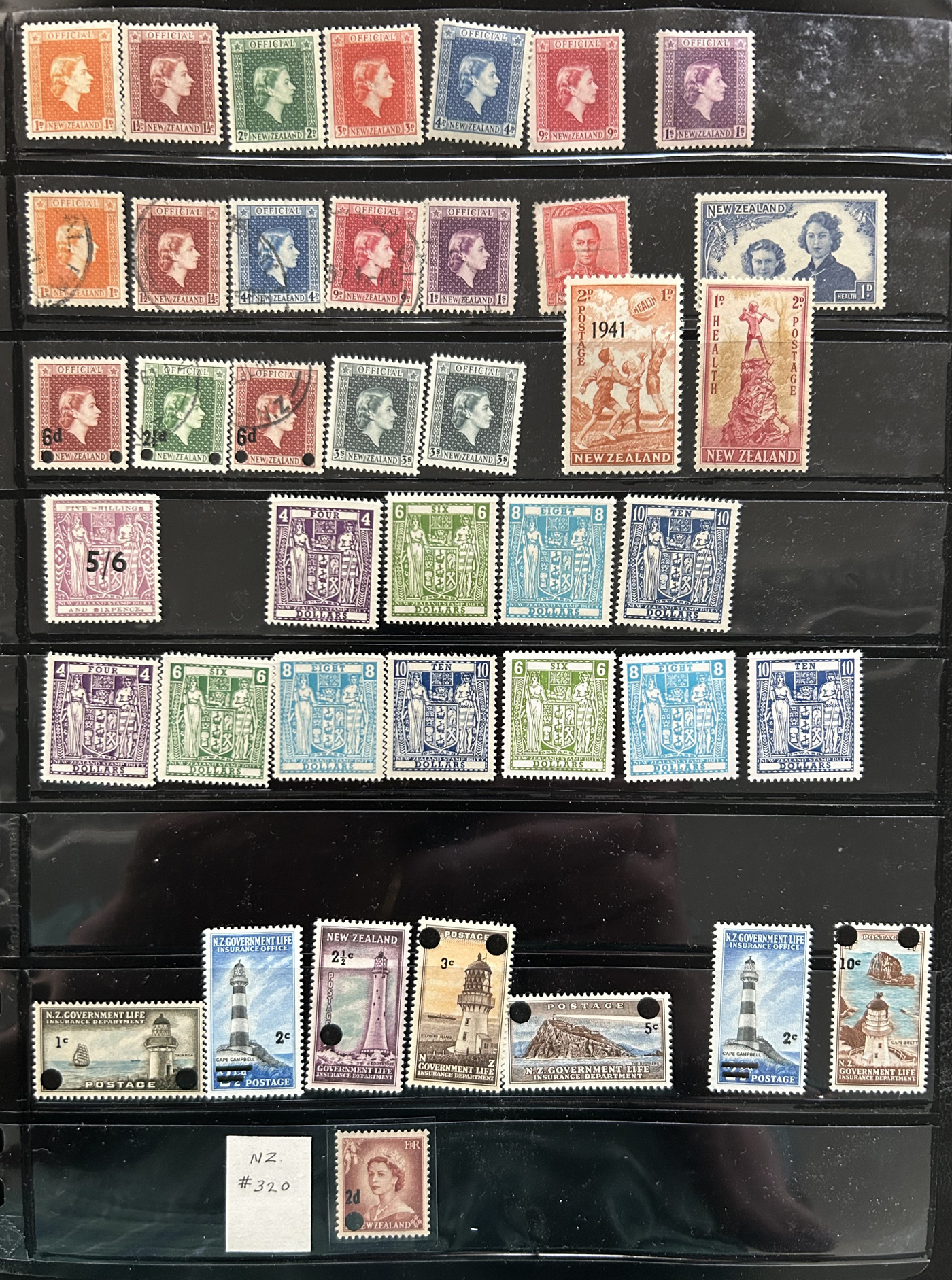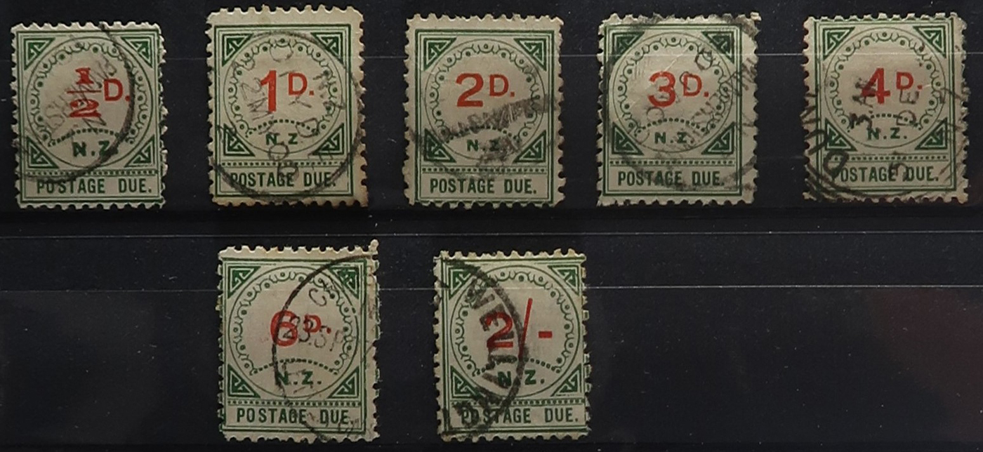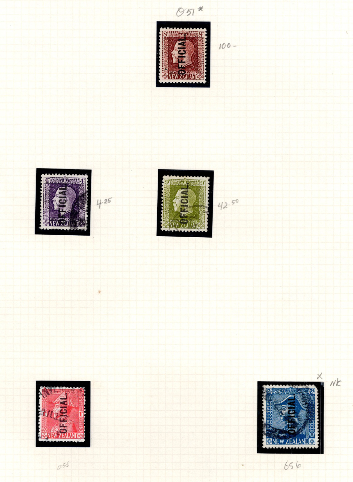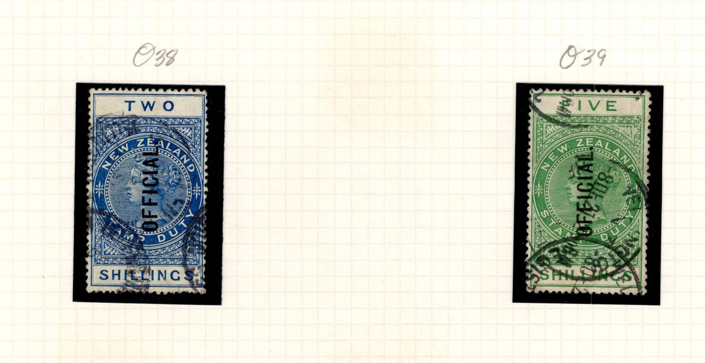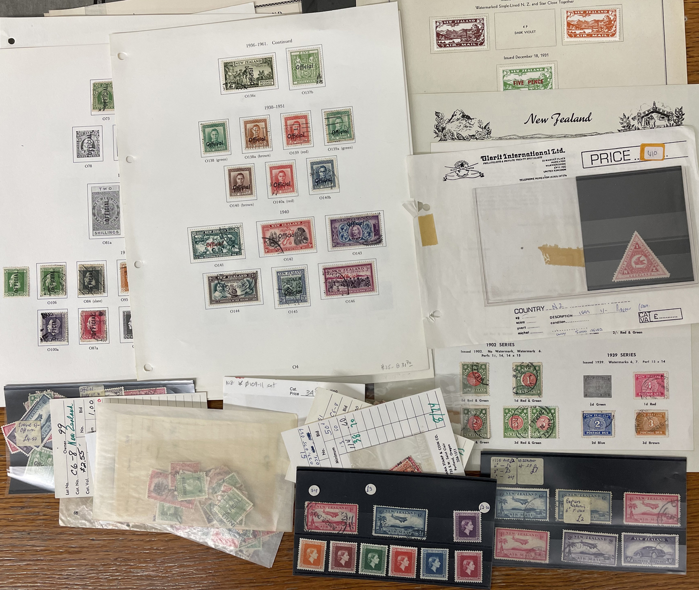1644 O/og   imageAccumulation of Mint and Used Back of the Book New Zealand, 1900s-1950s, with a few hundred stamps, in album pages, glassines, and dealer cards. The lot primarily contains mint and or used officials, along with airmails and postage dues. A cursory check revealed a few interesting items such as Scott #s J1-J4, J7, J11 (used, c.v. $393 total), J22-J29 (mh, $80 total), C1, C3-C4 (mh, $77 total), O29 (x2, 1 mh, 1 used, $325 total), O92-O99 (mh, $77 total), leaving other finds to the dedicated collector, including Scott O9 "O.P.S.O." overprint in blue. A few faults with a few of the stamps, overall fine to very fine. Our photos show a small sample and overview. (Scan 1) (Scan 2) (Scan 3) (Scan 4) (Scan 5) (All Scans)