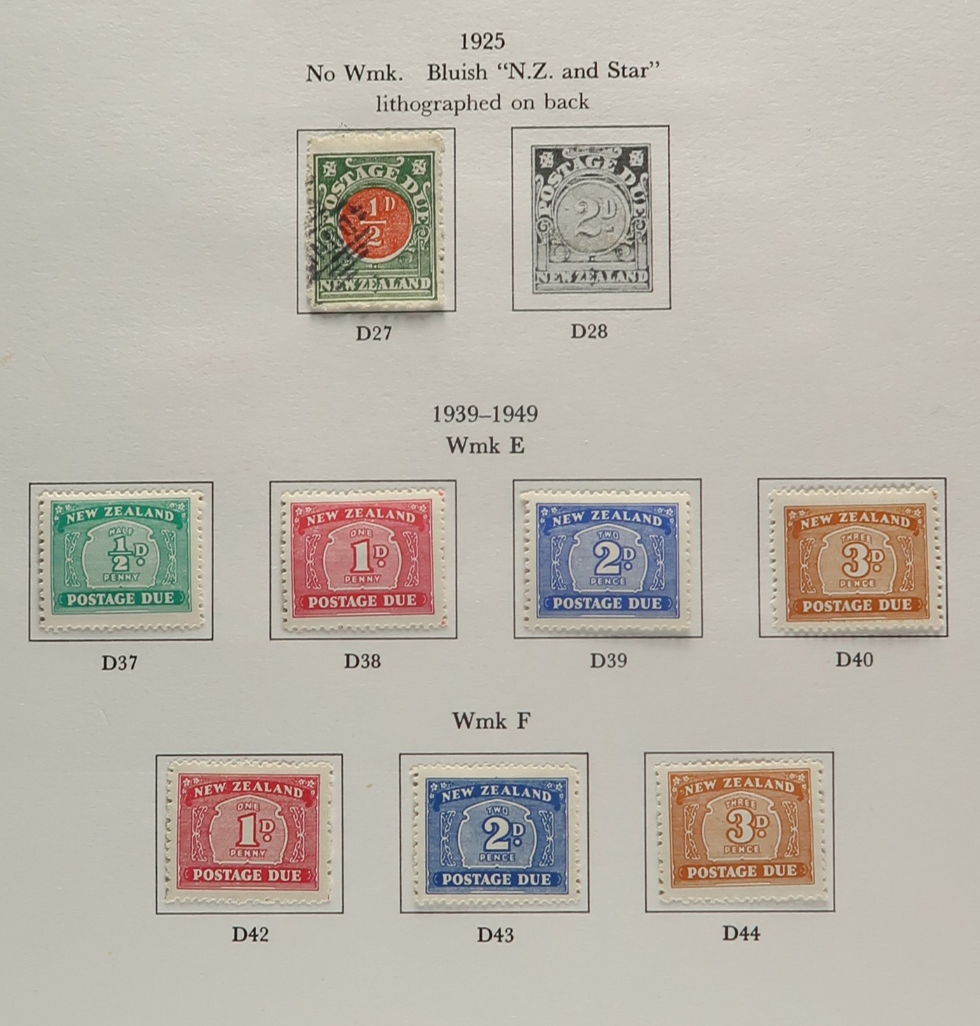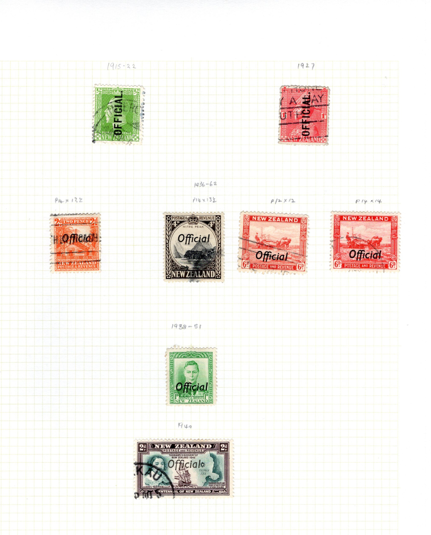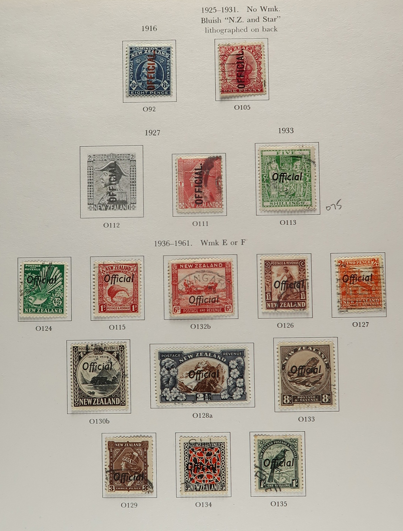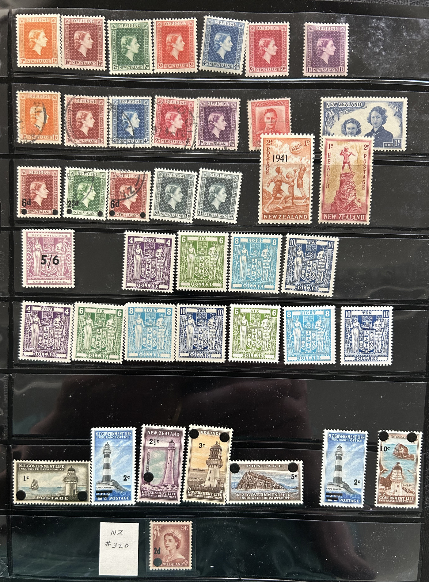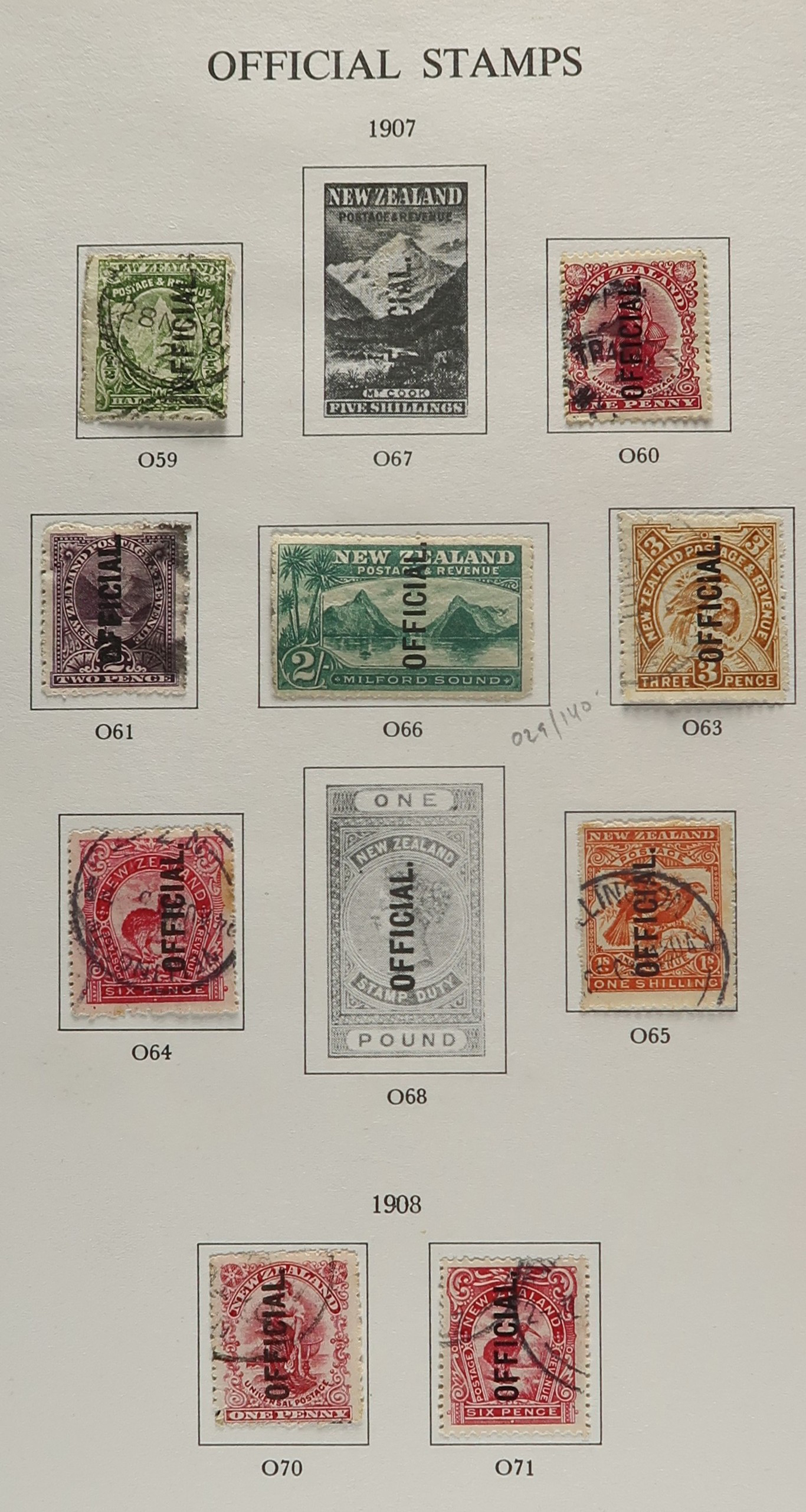 1644 O/og   imageAccumulation of Mint and Used Back of the Book New Zealand, 1900s-1950s, with a few hundred stamps, in album pages, glassines, and dealer cards. The lot primarily contains mint and or used officials, along with airmails and postage dues. A cursory check revealed a few interesting items such as Scott #s J1-J4, J7, J11 (used, c.v. $393 total), J22-J29 (mh, $80 total), C1, C3-C4 (mh, $77 total), O29 (x2, 1 mh, 1 used, $325 total), O92-O99 (mh, $77 total), leaving other finds to the dedicated collector, including Scott O9 "O.P.S.O." overprint in blue. A few faults with a few of the stamps, overall fine to very fine. Our photos show a small sample and overview. (Scan 1) (Scan 2) (Scan 3) (Scan 4) (Scan 5) (All Scans)