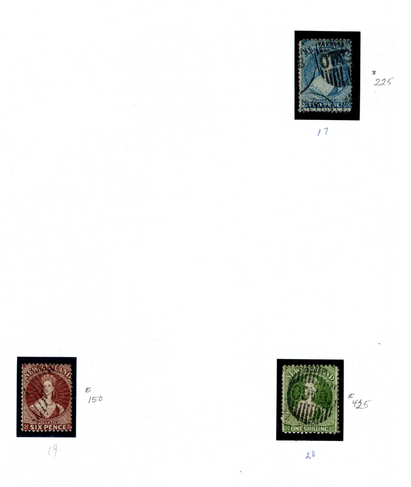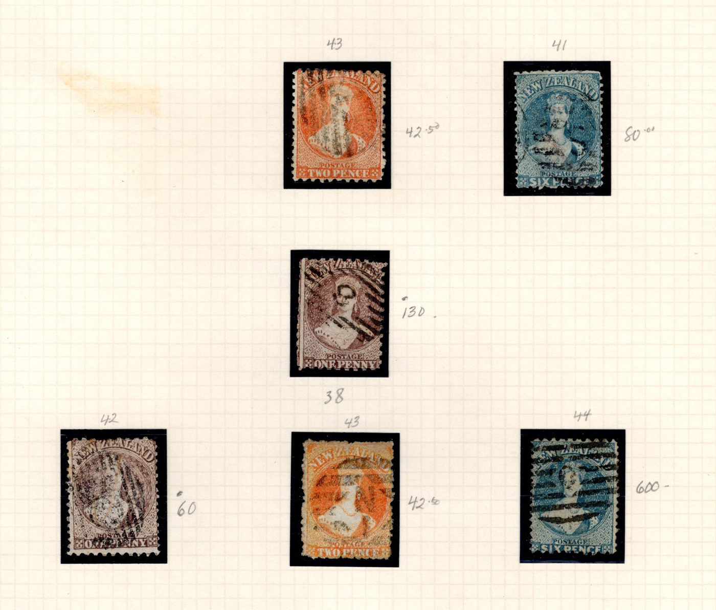 1643 O/og   imageTwo Collections of Mint and Used New Zealand on Pages, first one starts off with 12 used Chalon portraits, with #s (as per owner, unchecked by us) 15, 17, 19, 20, 25b, 31, 38, 41, 42, 43, 44 (owner's c.v. of $2,200). These followed by a collection of mint and used (#s 122/404 and B1/B6, O38/O56), plus 4 pages of duplicated used early definitives Catalogue after the Chalons was $890, for a total of $3,090 (in 2014). Second collection is on 13 S.G. quadrille pages and starts with 6 Chalons (mostly faulty) followed by a decent collection of mostly used to about1980s. (Scan 1) (Scan 2) (Scan 3) (Scan 4) (Scan 5) (Scan 6) (Scan 7) (Scan 8) (Scan 9) (Scan 10) (Scan 11) (Scan 12) (All Scans)