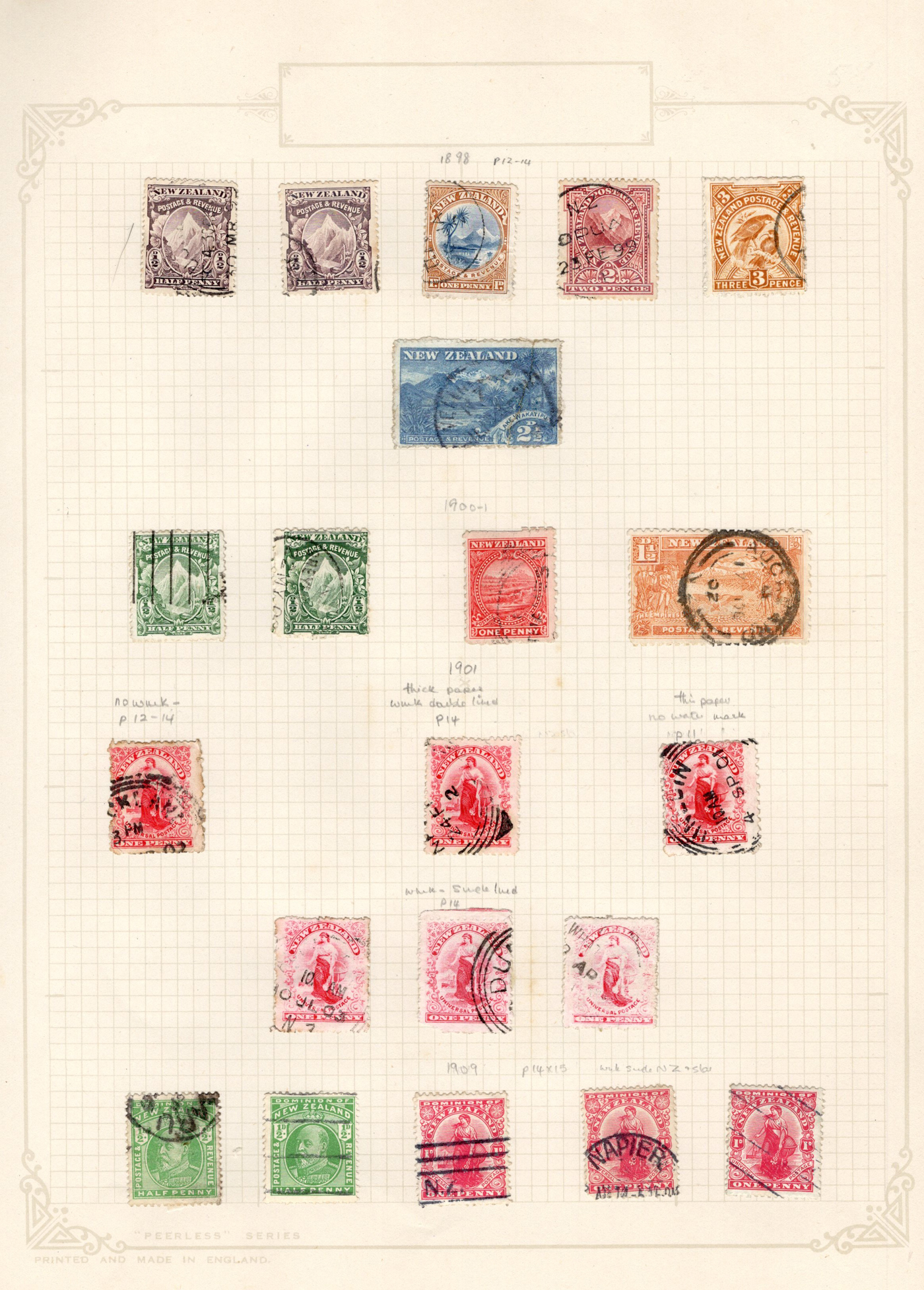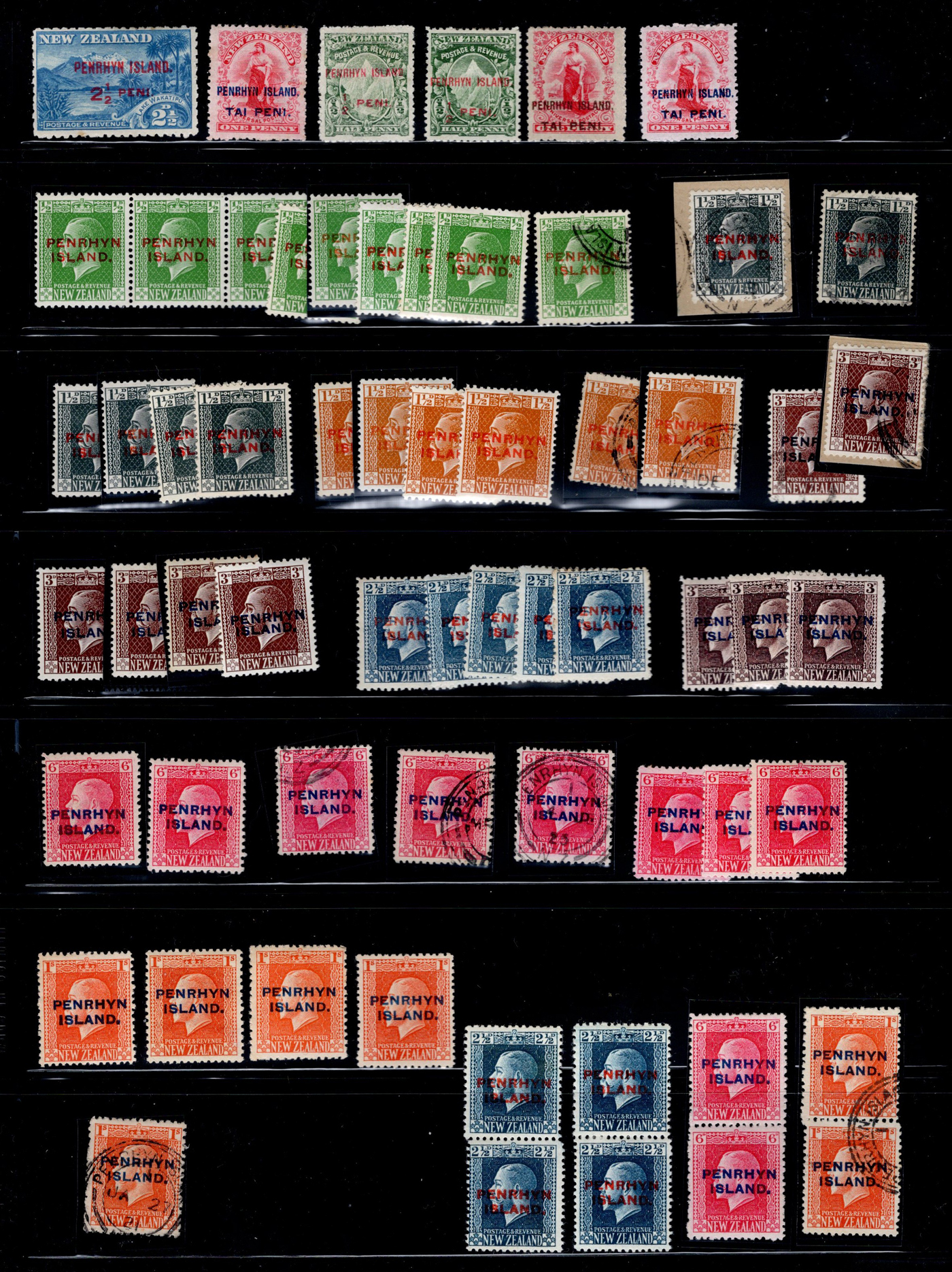 1649 O/og 1/24 imageAttractive Page with Penrhyn Island Overprints on New Zealand Stamps, a mix of mint and used. While there is more mint than used, the value is in the used (a couple are on piece), including #18-20, 23-24. These regular issues catalogue U$492.00 by 2024 Scott. Plus, there are four “2-perf pairs”, including a scarce used 1sh pair which list in Stanley Gibbons at £420 alone. The blended catalogue value comes to C$1,445.