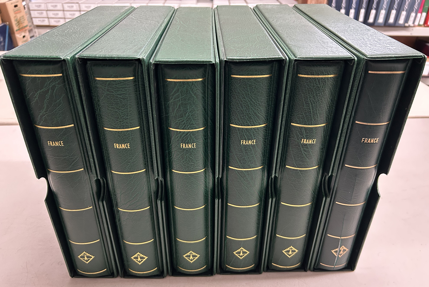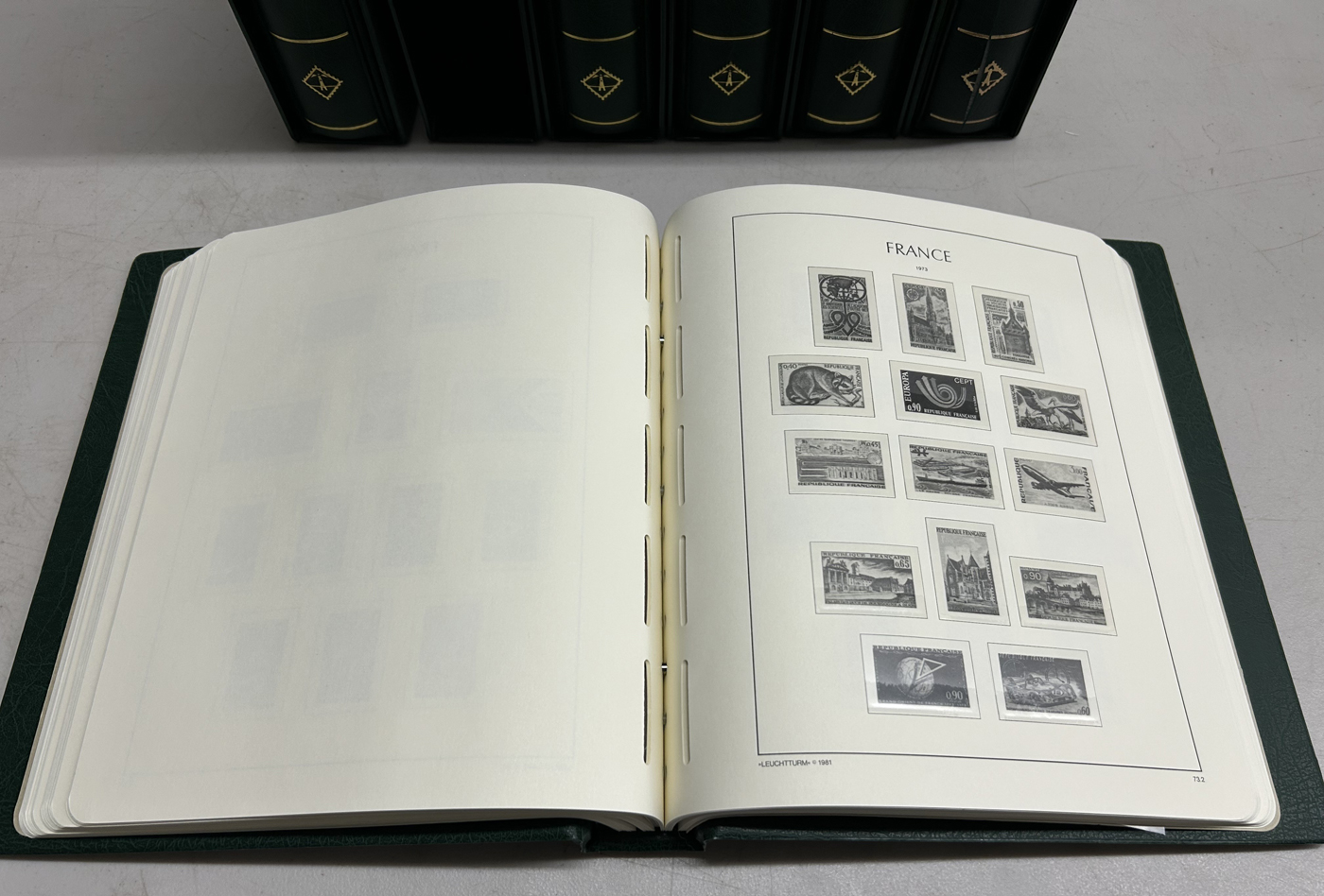 1692   imageSet of Lighthouse Hingeless Albums for France, 1849 to 2008, in 6 deluxe albums in green, with country name in gold, each with its own matching slip case, including back of the book. These are in like-new condition and only lightly used once. The pages alone cost over $1,400 new, plus another $900 for the albums and their slipcases comes to over $2,300. Your stamps deserve a good quality display. (Scan 1) (Scan 2) (All Scans)