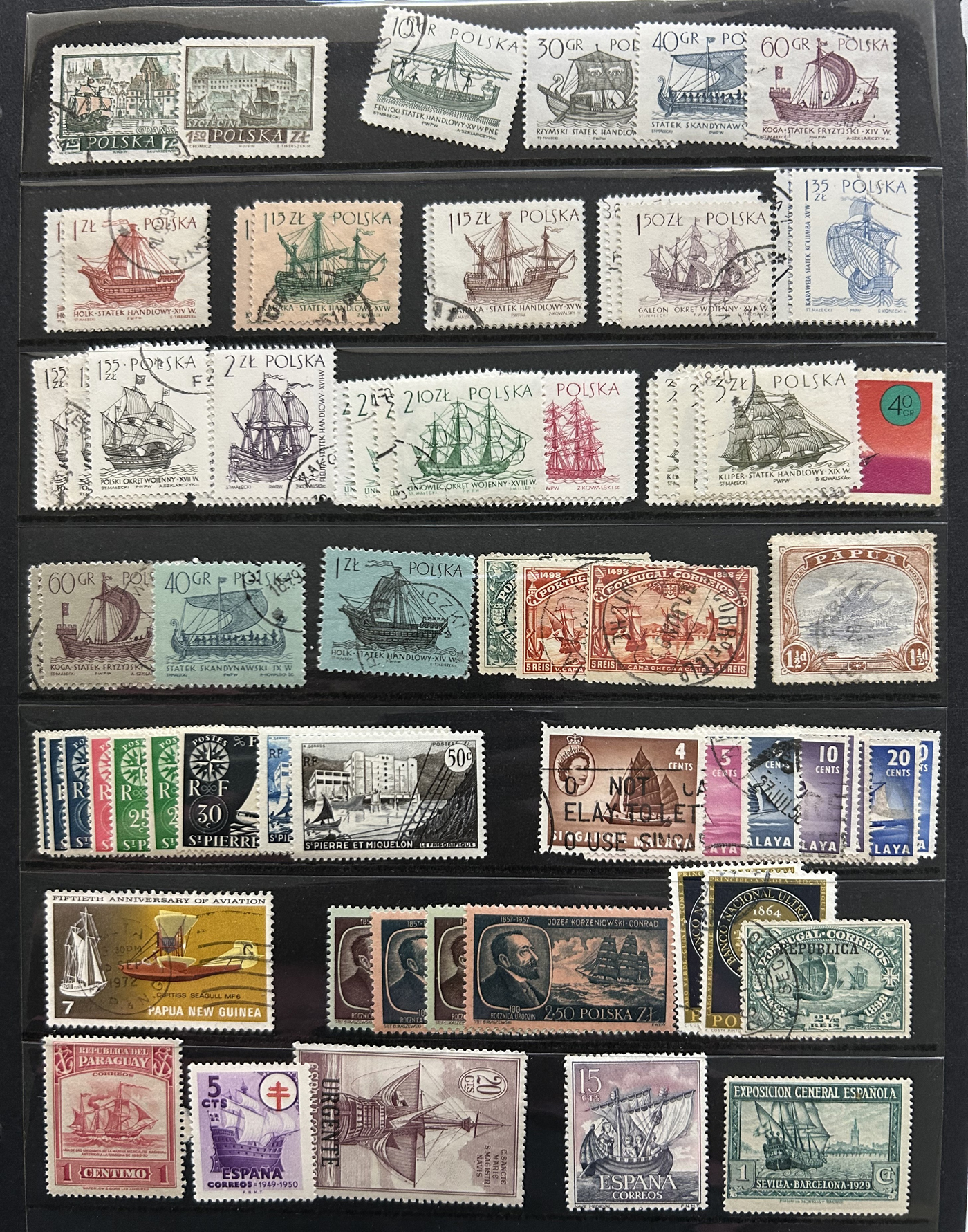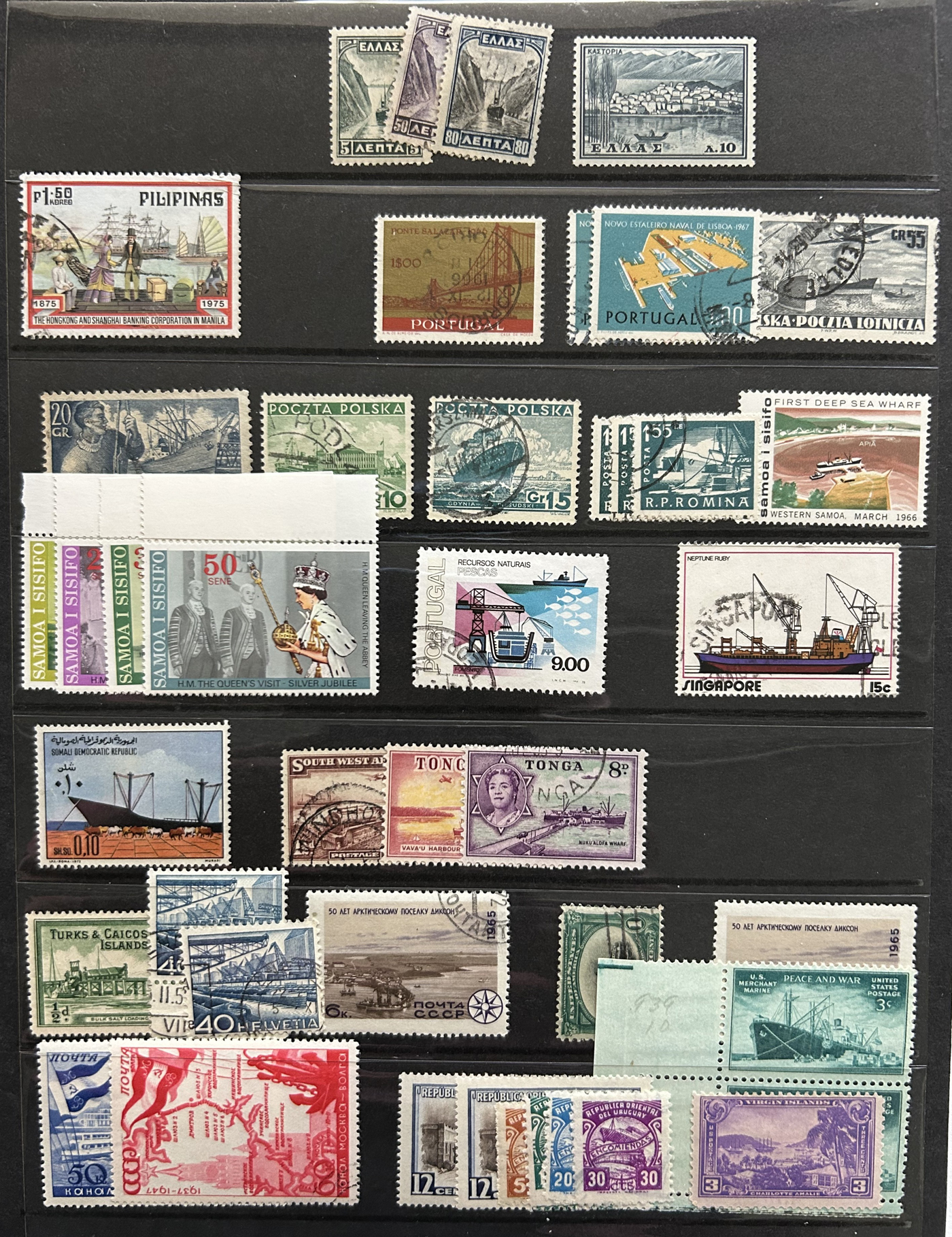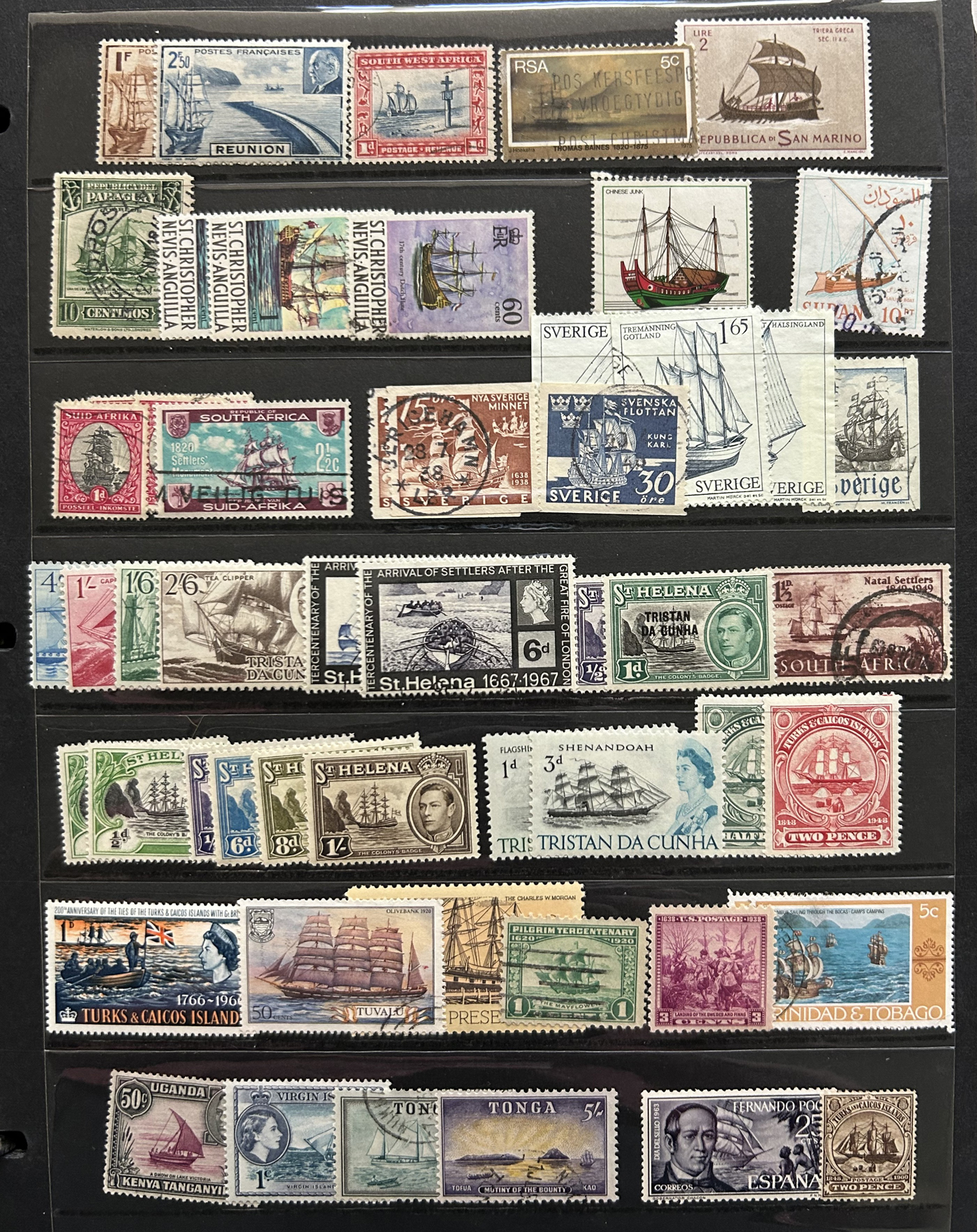 1688 O/og   imageLarge Collection of Ships on Stamps Topical, consisting of three distinct collections: the first is a specialized "Survival and Rescue from the Water" on about 45 special pages with lots of additional write-ups, etc., with hundreds of fund-raising labels, carriage stamps and other cinderella-type of stamps (singles, sets, sheetlets, souvenir sheets). The second is in an old-time (1948) "Ships on Stamps" special album containing perhaps half of the used stamps proposed by the album, all arranged by country (noted a VFLH Canada 50c Bluenose). The third is a lifetime collection containing thousands of mint and used stamps neatly mounted on pages filling two thick binders, all arranged by country, noting several better sets from a great variety of different countries. A wonderful offering, see pictures for a very small representative peek from each collection. (Scan 1) (Scan 2) (Scan 3) (Scan 4) (Scan 5) (Scan 6) (Scan 7) (Scan 8) (Scan 9) (Scan 10) (Scan 11) (Scan 12) (Scan 13) (Scan 14) (Scan 15) (Scan 16) (Scan 17) (Scan 18) (Scan 19) (Scan 20) (Scan 21) (Scan 22) (Scan 23) (Scan 24) (Scan 25) (Scan 26) (Scan 27) (Scan 28) (All Scans)