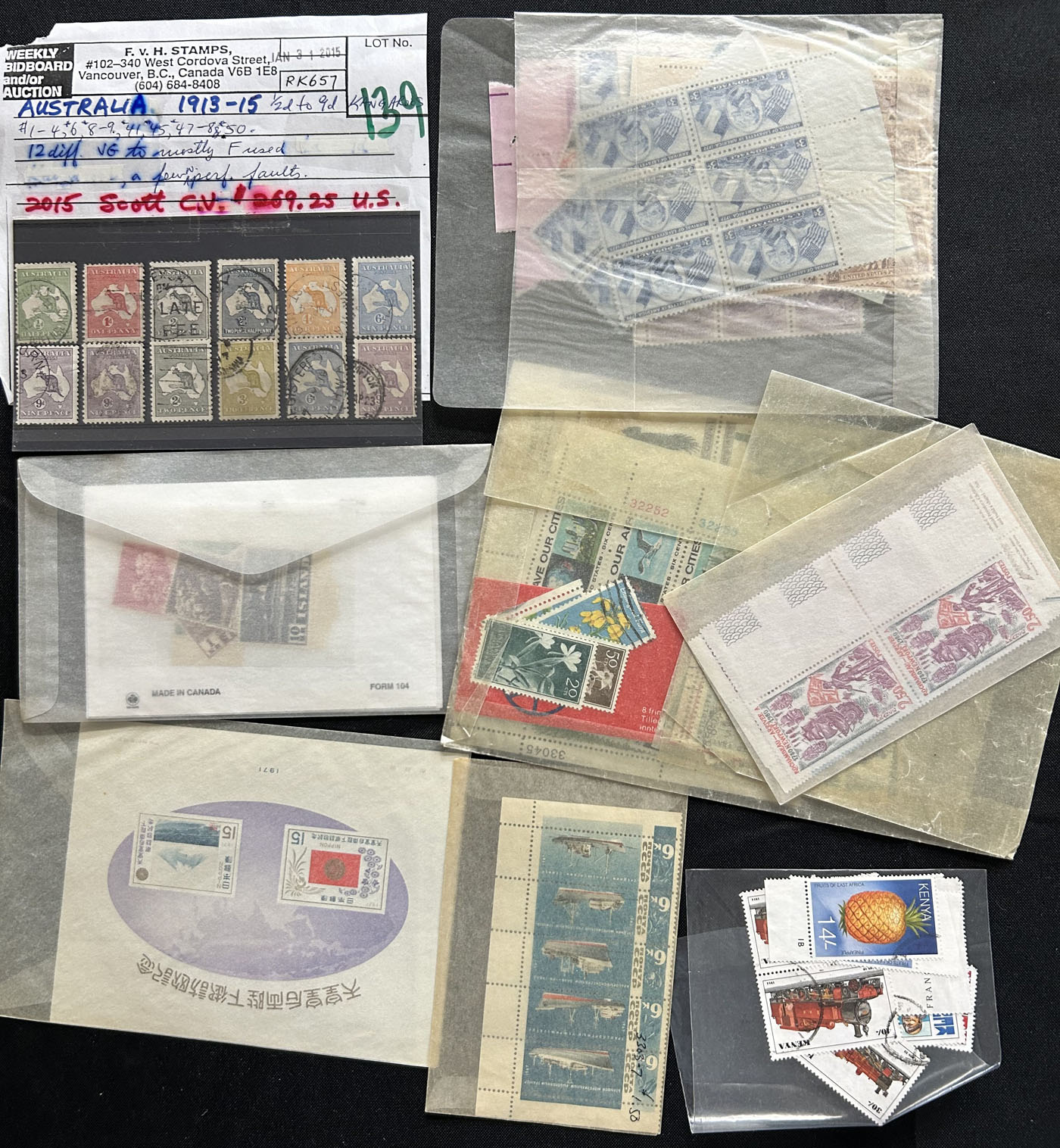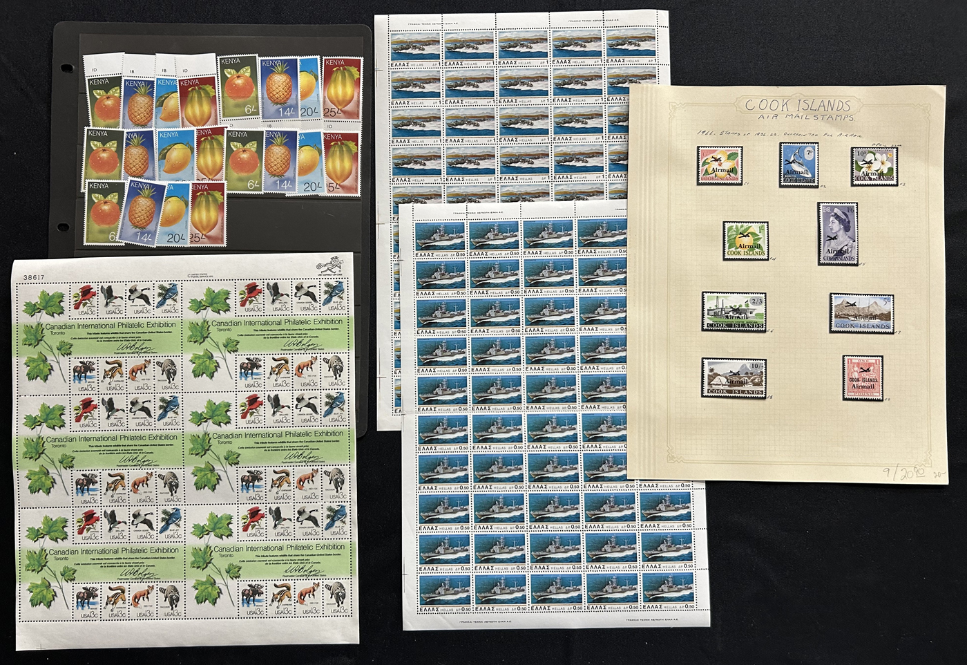 1684 O/og/nh   imageDiverse but Useful Consignment Remainder Lot,starts with a fresh mint collection of Cook Islands (#48/205, C1-C11, $396), collection of mint St Helena on a few pages ($110), page of early mint Aden, same for Australia, stock card with a selection of 15 mint early French Southern Antarctic Territory (roughly $100), mint and used Malta, Réunion and Cyprus collections, a few souvenir sheets, a stack of 16 NH United Nations Flag stamps, a large glassine with mint France issues, a stock card with 12 different used Australian Kangaroos (2013 c.v. was $269), a binder containing a collection of FDC plus matching stamps of Republic of South Africa from the 1970s, 5 sets of NH Kenya 713-16 ($45), Ireland #161-62 (NH), Iran #C79-82 (mint, $200), Ross Dependencies #L1-L8 (NH), Iceland #246-252 (NH, $85), plus various other items. Overall fine to very fine. (Scan 1) (Scan 2) (Scan 3) (Scan 4) (Scan 5) (Scan 6) (Scan 7) (Scan 8) (Scan 9) (Scan 10) (All Scans)