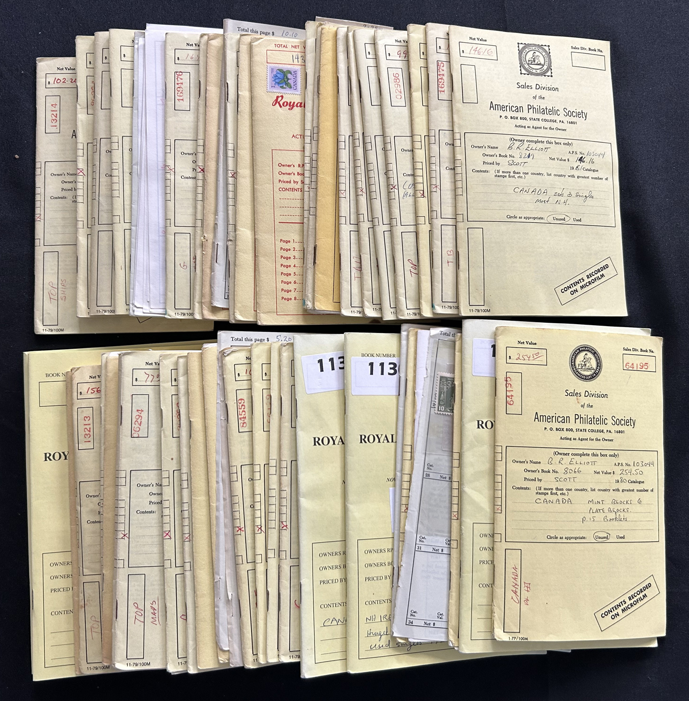 1686 O/og/nh   imageLarge Group of Circulated and Uncirculated Sales Circuit Books, with 47 in all (APS and RPSC), with a great variety of material, including several Canada, British Commonwealth and worldwide countries as well as a few topicals. Mix of used, mint hinged and mint never hinged, with singles, complete sets, blocks, plate blocks, etc. We counted a remaining value of $3,647 (which appears to be at least close), not counting those that don't yet have tallies or totals. Should easily be a bargain at our estimated value.