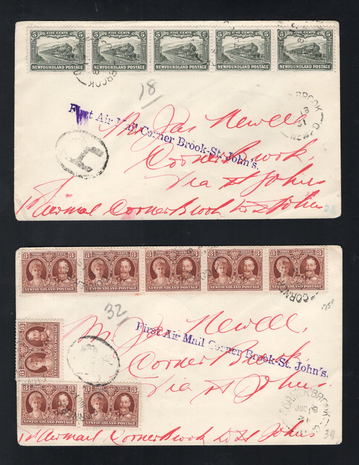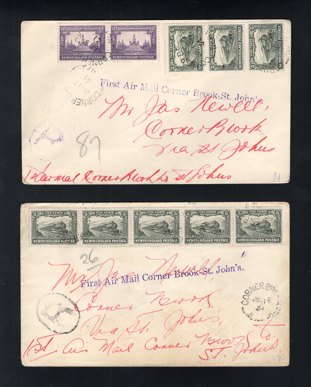 315 CVR   imageGroup of Four 1931 Newfoundland First Flight Registered Covers, all have the one-line "First Air Mail Corner Brook-St John's" purple flight cachet (front and back), all mailed from Corner Brook on JUL.18.1931 and addressed to the same person in St John's (with JUL.21 large double-circle receiver on back). Frankings consist of a variety of 1938-1931 Pictorials (3c, 5c and 10c) with rates of 24c, 25c and 35c. Fine to very fine. (Scan 1) (Scan 2) (All Scans) (All Images)