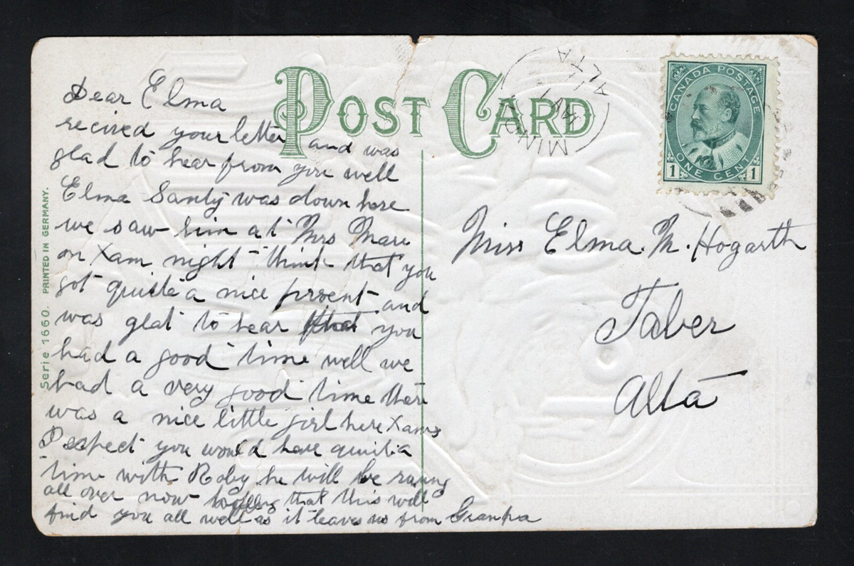 302 PC   image1911 Minda Alta Postmark on Postcard, mailed on JAN.1.1911 (broken circle free strike) to Taber, Alberta. Couple of creases, still a very scarce postmark, as the Minda post office was only open from 1910 to 1917.