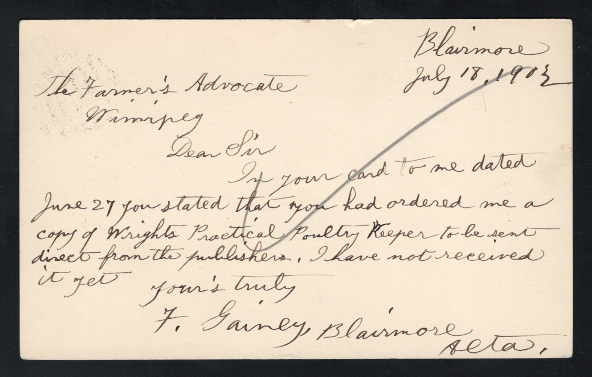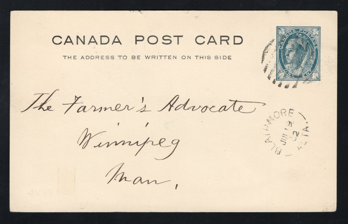 303 PC   image1902 Blairmore Alta Postmark on Postal Card, a 1c green QV Leaf card mailed on JUl.19.1902 (fine free strike) to Winnipeg. Blairmore is a rare territorial Alberta postmark, as it was open only from 1899 to 1905, and is listed in Territorial Post Offices of Canada at RF E. (Scan 1) (Scan 2) (All Scans) (All Images)