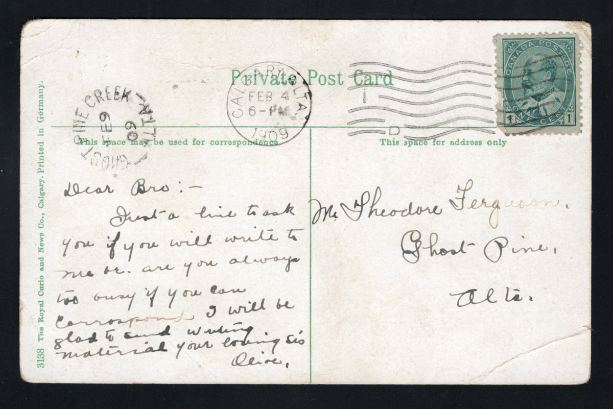 304 PC   image1909 Ghost Pine Creek Alta Postmark on Postcard, a "Central Methodist Church, Calgary, Alta." card mailed from Calgary on FEB.4.1909 to Ghost Pine, with a very fine FEB.9.1909 broken circle receiver. Corner crease, else fine. A scarce postmark. (Scan 1) (Scan 2) (All Scans) (All Images)