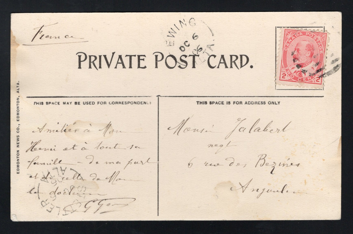 305 PC   image1906 Ewing and Stetler Alta Postmark on Postcard, "A view of the Saskatchewan River, near Edmonton, Alta." postcard mailed from Ewing on OCT.6.1906 (fine broken circle free strike) to Anjouleme, France, via Stetler, Alta (same day broken circle transit), small stain on one edge, still very fine. The Ewing post office was open from 1903 to 1926. (Scan 1) (Scan 2) (All Scans) (All Images)