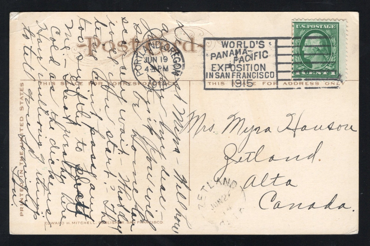 306 PC   image1914 Zetland Alta Postmark on Postcard, mailed from Portland, Oregon on JUN.19.1914 ("World's Panama - Pacific Exposition in San Francisco" slogan machine) to Zetland, with a fine JUN.26 broken circle receiver, very fine. Open from 1912 to 1927 only.