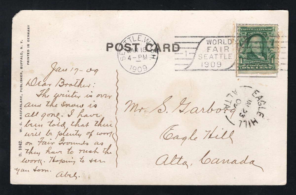 307 PC   image1909 Eagle Hill Alta Postmark on Postcard, mailed from Seattle, Washington on JAN.18.1909 ("World's Fair Seattle" slogan machine) to Eagle Hill, with a very fine JAN.23.1909 broken circle receiver, very fine. A scarce postmark. (Scan 1) (Scan 2) (All Scans) (All Images)