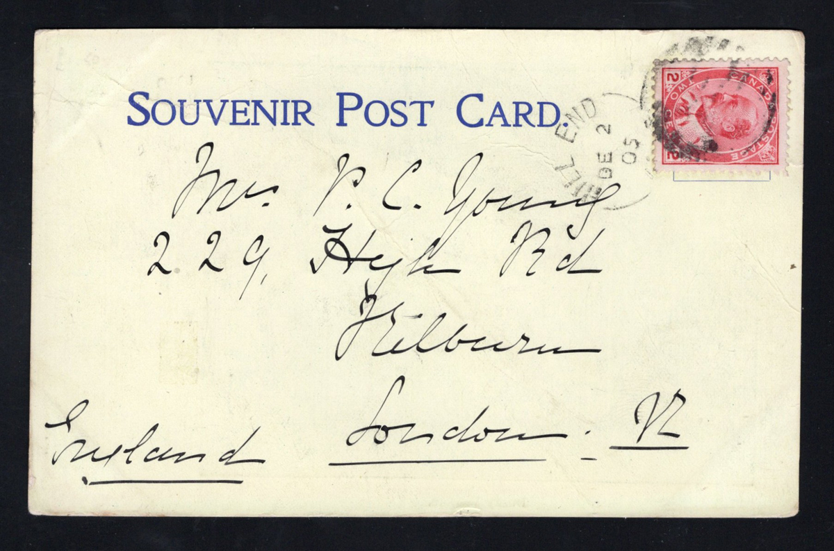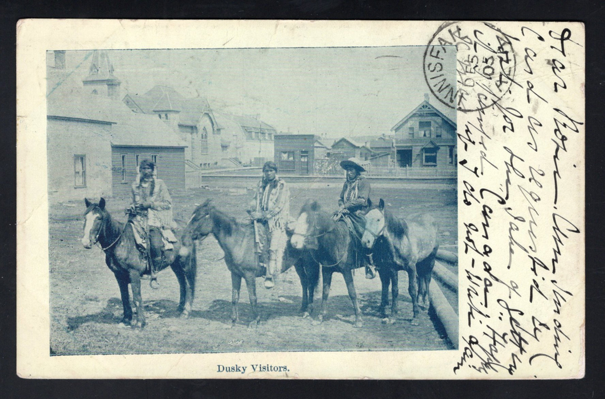 308 PC   image1905 Hill End Alta Postmark on Postcard, a "Souvenir Post Card" depicting a scene captioned "Dusky Visitors" mailed on DEC.2.1905 (fine strike of the broken circle) to England, through Innisfail Alberta (DEC.5 c.d.s. transit on picture side), very fine. This post office was open from 1902 to 1928 only. (Scan 1) (Scan 2) (All Scans) (All Images)