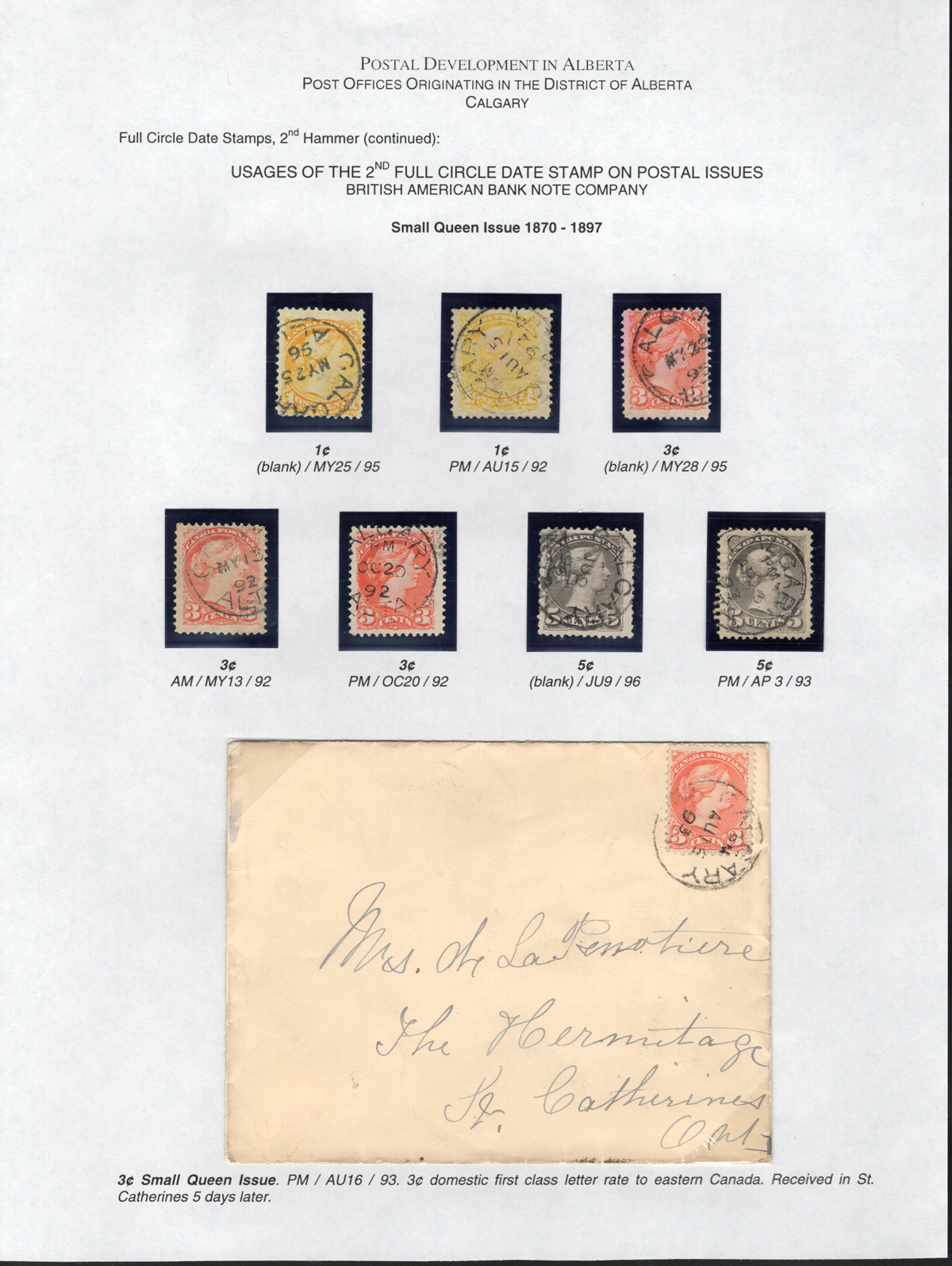 312 O/CVR   imagePage of Calgary, Alberta C.D.S. Cancels on Small Queens, dated between 1892 and 1895, on seven Small Queens (2x 1c, 3x 3c and 2x 5c) plus one tying a 3c SQ on a cover to St Catherines, Ont. Very fine.