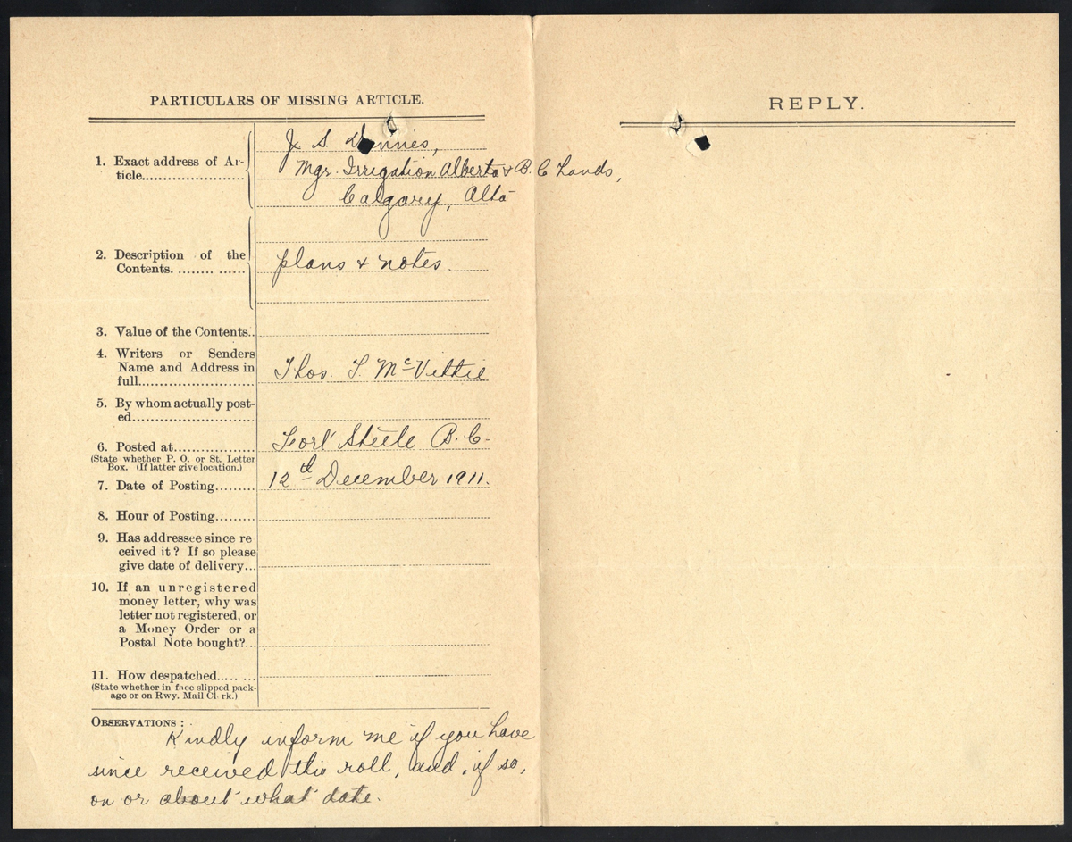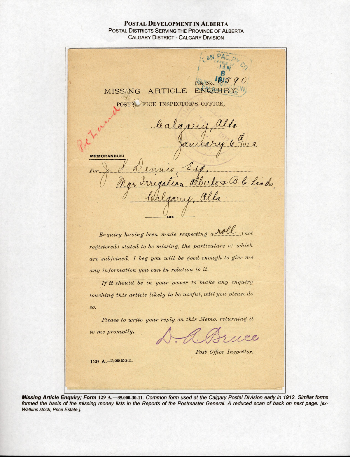 314   image1912 Calgary, Alberta Missing Article Enquiry Official Form, dated JAN.6.1912, this is a scarce Form 129 A. 35,000-30-3-11. The form is filled-out indicating that a roll containing plans and notes which had been mailed on DEC.12.1911 at Fort Steele BC has gone missing. The top of the form shows two different Canadian Pacific Railway Co. postmarks (one octagonal in blue and one a large double circle in violet). Very fine. (Scan 1) (Scan 2) (All Scans) (All Images)