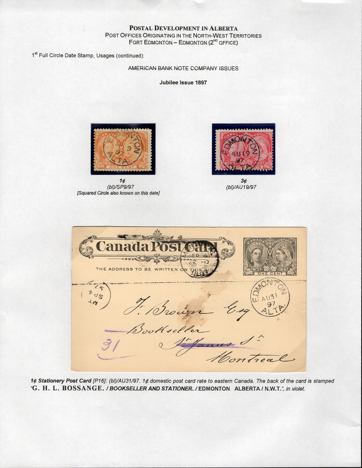 313 O/PC   image Edmonton, Alta. C.D.S. Postmarks on Three Jubilee Items, a very fine strike each on a 1c and 3c Jubilee issues, plus a despatch example on a 3c Jubilee postal card mailed to Montréal (with "G.H.L. Bossange / Bookseller and Stationer / Edmonton, Alberta / N.W.T.” purple business hand stamp on back). Light stain on front of the card, else very fine. (Scan 1) (Scan 2) (All Scans) (All Images)