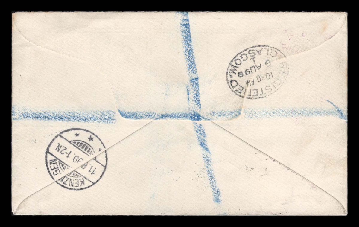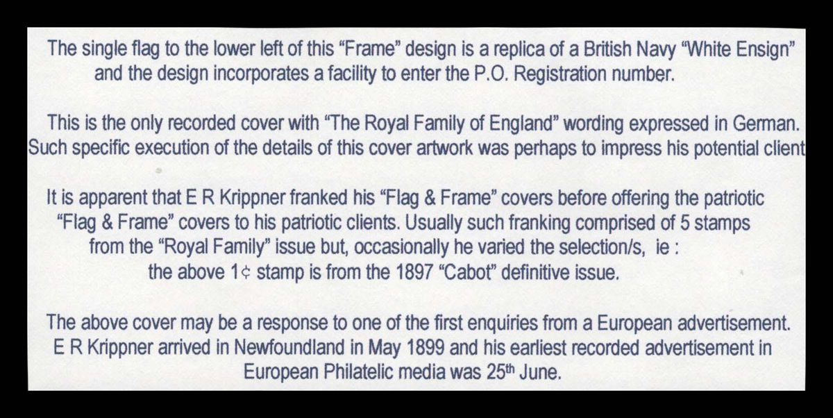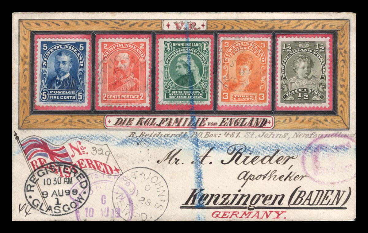 320 CVR 61/85 image1899 E.R. Krippner Hand Illustrated Registered Cover to Germany, mailed on JUL.28.1899 (c.d.s. free strike) to Kenzigen, Germany (AUG.11.1899 receiver) through Glasgow (AUG.9 oval registration datestamps front and back), London (AUG.10 “hooded” c.d.s.). A nicely illustrated cover franked with four different Royal Family issues plus a 1c Cabot, captioned (in German, thus the only recorded as such) “The Royal Family of England”. Very fine and accompanied by a write-up. Ex Motson. (Scan 1) (Scan 2) (Scan 3) (All Scans) (All Images)