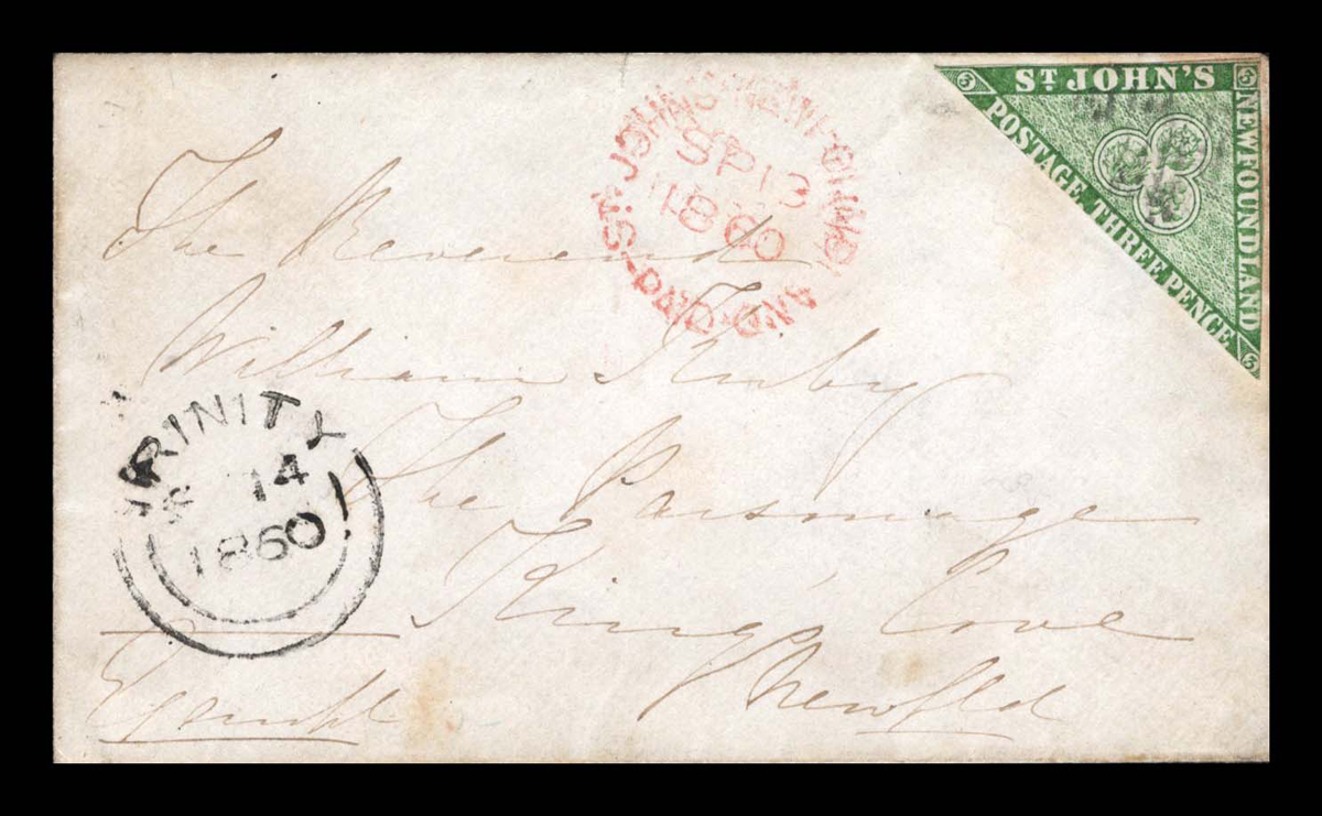 316 CVR 3 image3d Green Imperforate on 1860 Cover from St John’s to King's Cove, mailed St John’s on SEP.13.1860 (fine despatch free strike in red) to King's Cove (SEP.14 receiver on front), franked with a 3d green imperforate (1857 issue), not tied but belongs as there are no other rate markings. The earliest known date for the use of the second (1860) printing of this stamp is March 18, 1861, which makes this the first printing. Tear on back flap, else a fine cover with a scarce franking.