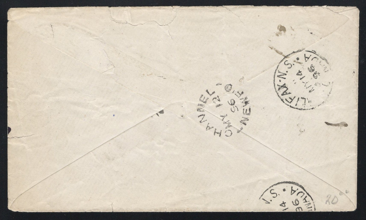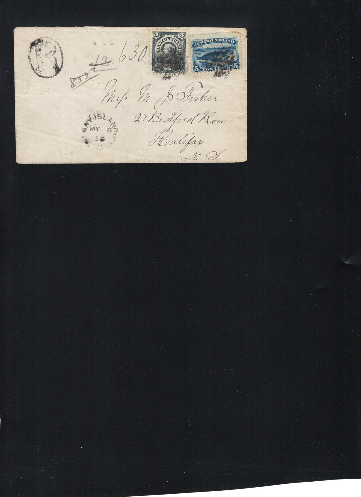319 CVR 55, 60 image1896 Registered Cover to Halifax, Nova Scotia, mailed from Bay Island on MAY.8.1896 (broken circle free strike) to Halifax NS (MAY.14 c.d.s. receiver) via Channel (MAY 12 broken circle transit). The cover is franked with a 5c bright blue Harp Seal and a 3c slate Queen Victoria, both tied by cork cancels. Wrinkles and small tears, else overall fine. (Scan 1) (Scan 2) (All Scans) (All Images)