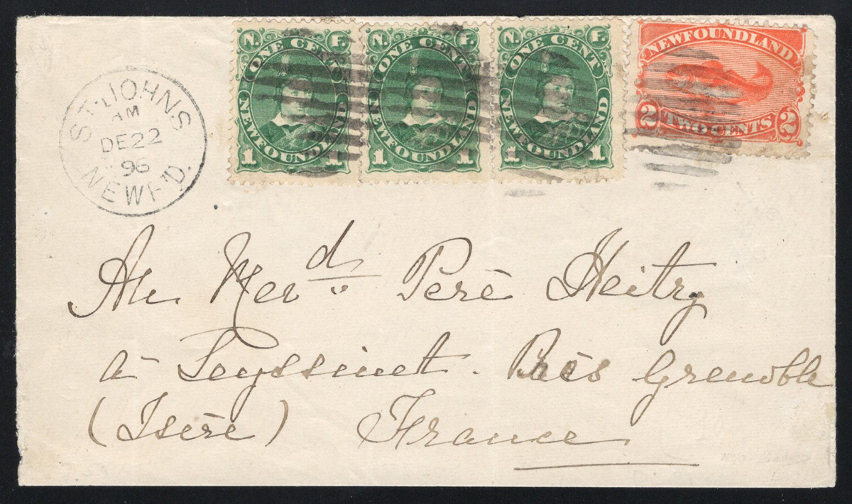 318 CVR 45, 48b image1896 Cover From St. John’s to France, mailed on DEC.22.1896 (c.d.s. free strike) to Seyssinet, France (JAN.6 1897 receiver) via Grenoble (JAN.6 transit), franked with three 1c green Prince of Wales and a 2c orange Codfish paying the 5c rate. Two light vertical creases do not affect the stamps, very fine. (Scan 1) (Scan 2) (All Scans) (All Images)