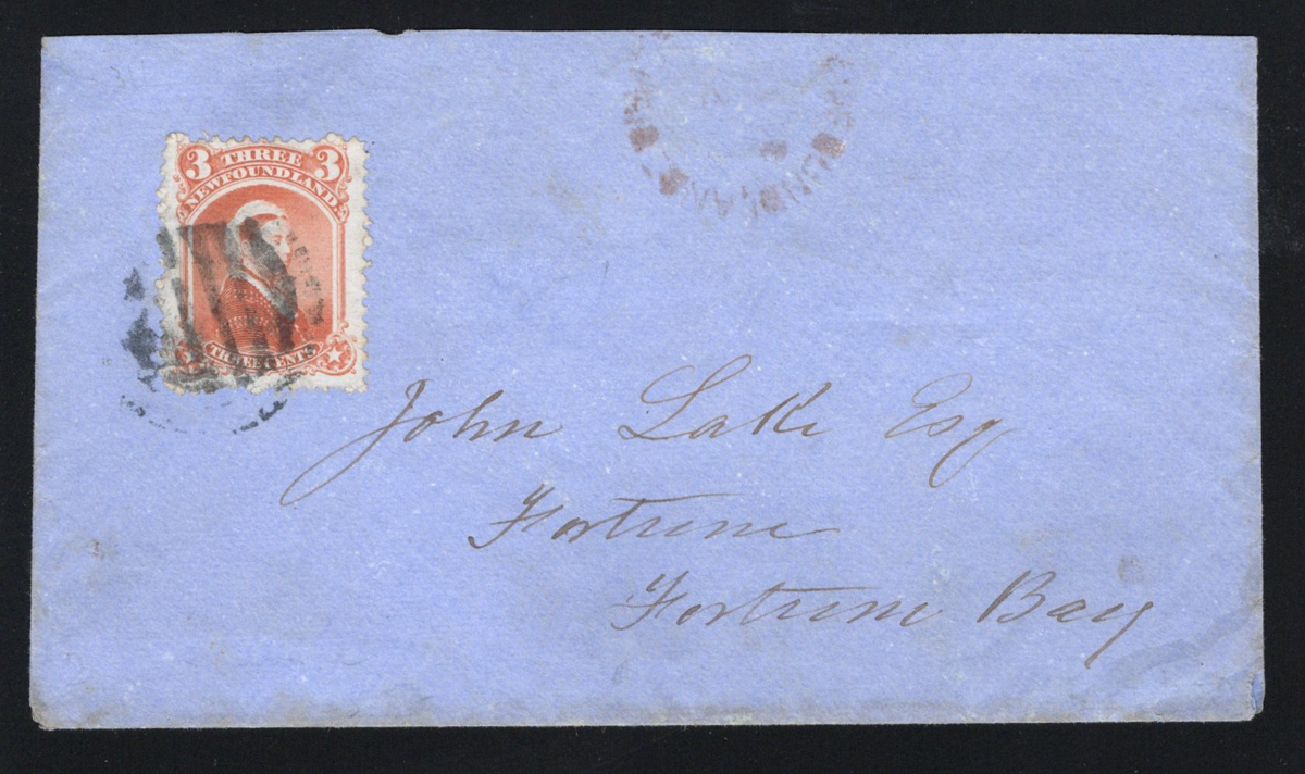 317 CVR 33 image1870 3c Vermilion on Domestic Letter, mailed from St. John’s on MAY.18.1873 (according to owner, as the date is very light) to Fortune Bay, franked with a 3c vermilion Widow Weeds (Scott 33, US$625 on cover) tied by a cork-inside-broken circle cancel. Top of back flap missing, else very fine and a scarce franking. Owner refers to "Sam Whaley’s Newfoundland 1865-1879, the New York Printings, a cover study" (page 79) which discusses the use of this stamp on cover, and which helped establish the date.