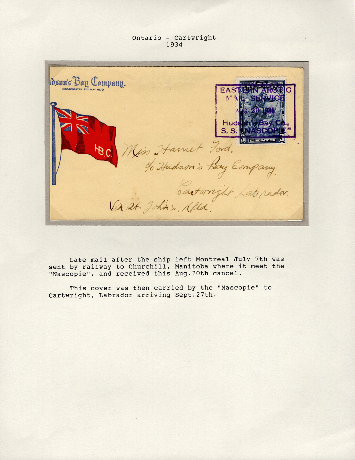 333 CVR   image1934 Churchill to Cartwright, Labrador, via S.S. Nascopie, mailed AUG.20.1934 on board while the icebreaker was in port at Churchill, Manitoba, addressed to Miss Harriet Ford, c/o Hudson's Bay Company / Cartwright Labrador / via St John's Nfld. Slightly reduced at left, still a very fine cover.