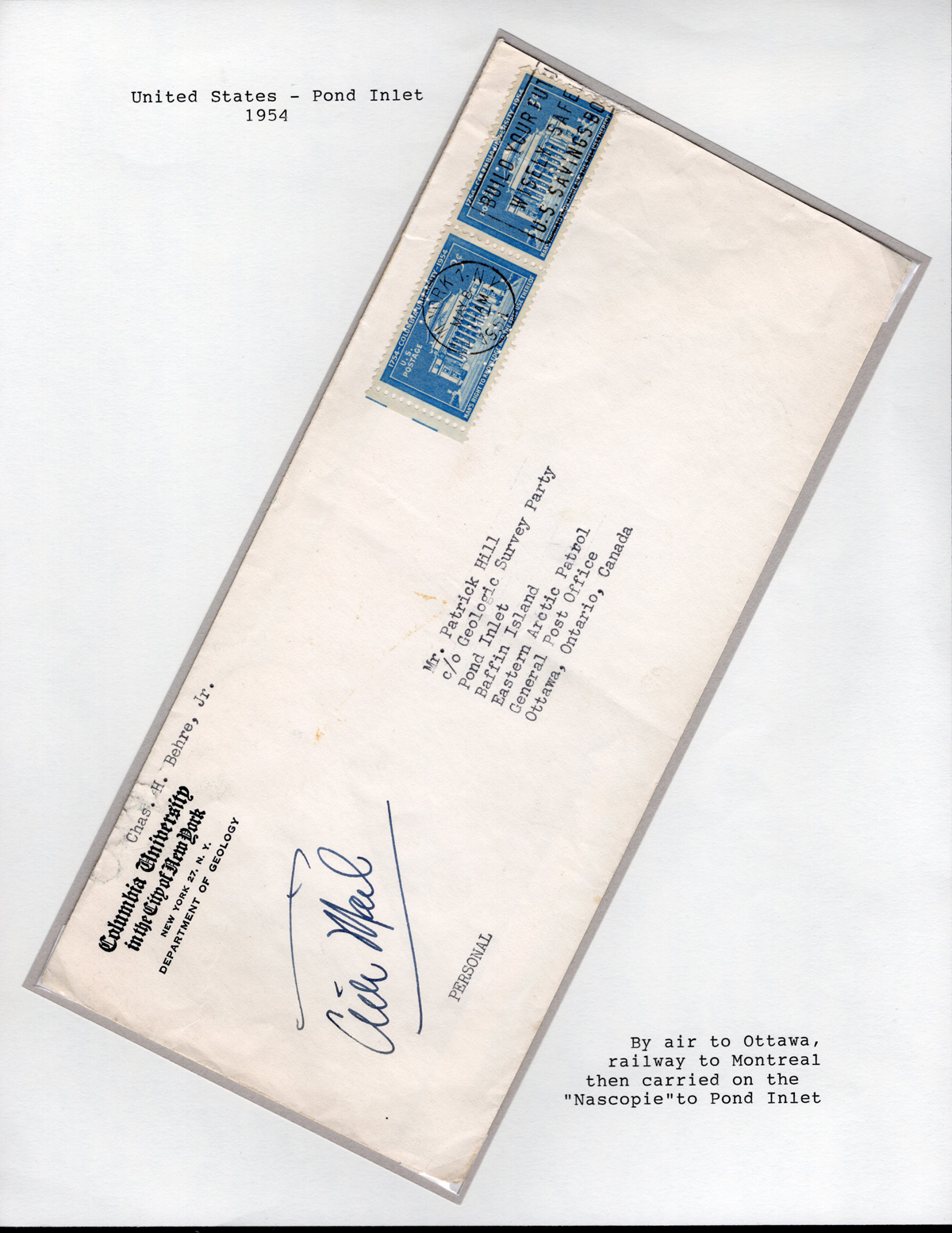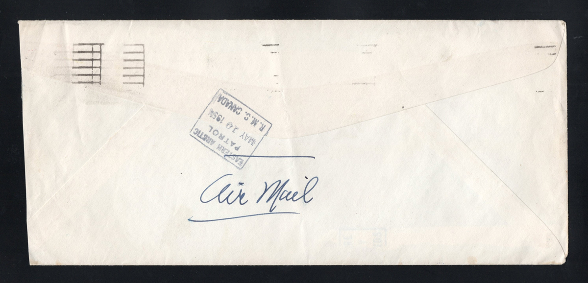 334 CVR   image1954 Pond Inlet, Baffin Island Incoming Airmail Cover from New York, via R.M.S. Nascopie, mailed on MAY.8.1954 to Patrick Hill, c/o Geologic Survey Party at Pond Inlet, Baffin Island, with MAY.10.1954 Eastern Arctic Patrol small boxed datestamp on back, light vertical bend otherwise very fine. (Scan 1) (Scan 2) (All Scans) (All Images)