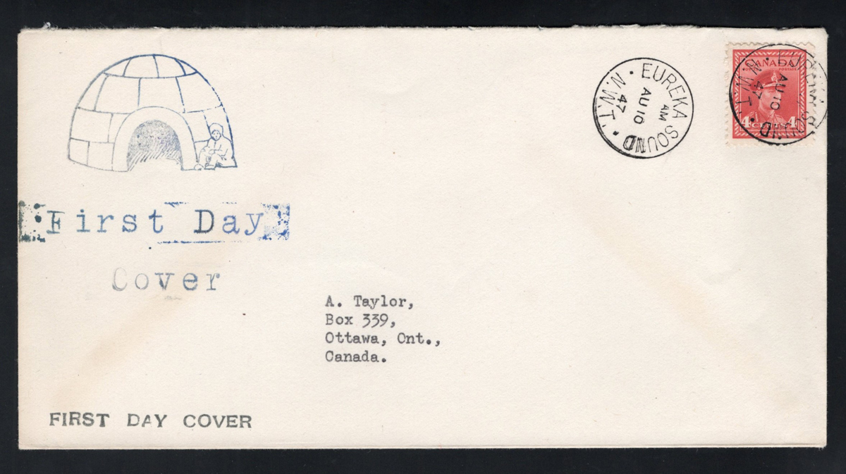 331 CVR   image1947 Eureka Sound, N.W.T. Cover, mailed on AUG.10.1947 (c.d.s. ties stamp, plus free strike) from military officer Major Taylor to himself in Ottawa. with First Day igloo cachet denoting first day of operation for this RF "E" post office, which closed on SEP.30.1948. Very fine and accompanied by a photocopy of a second cover (to his wife) with letter inside describing life "Up North". Very fine and scarce.
