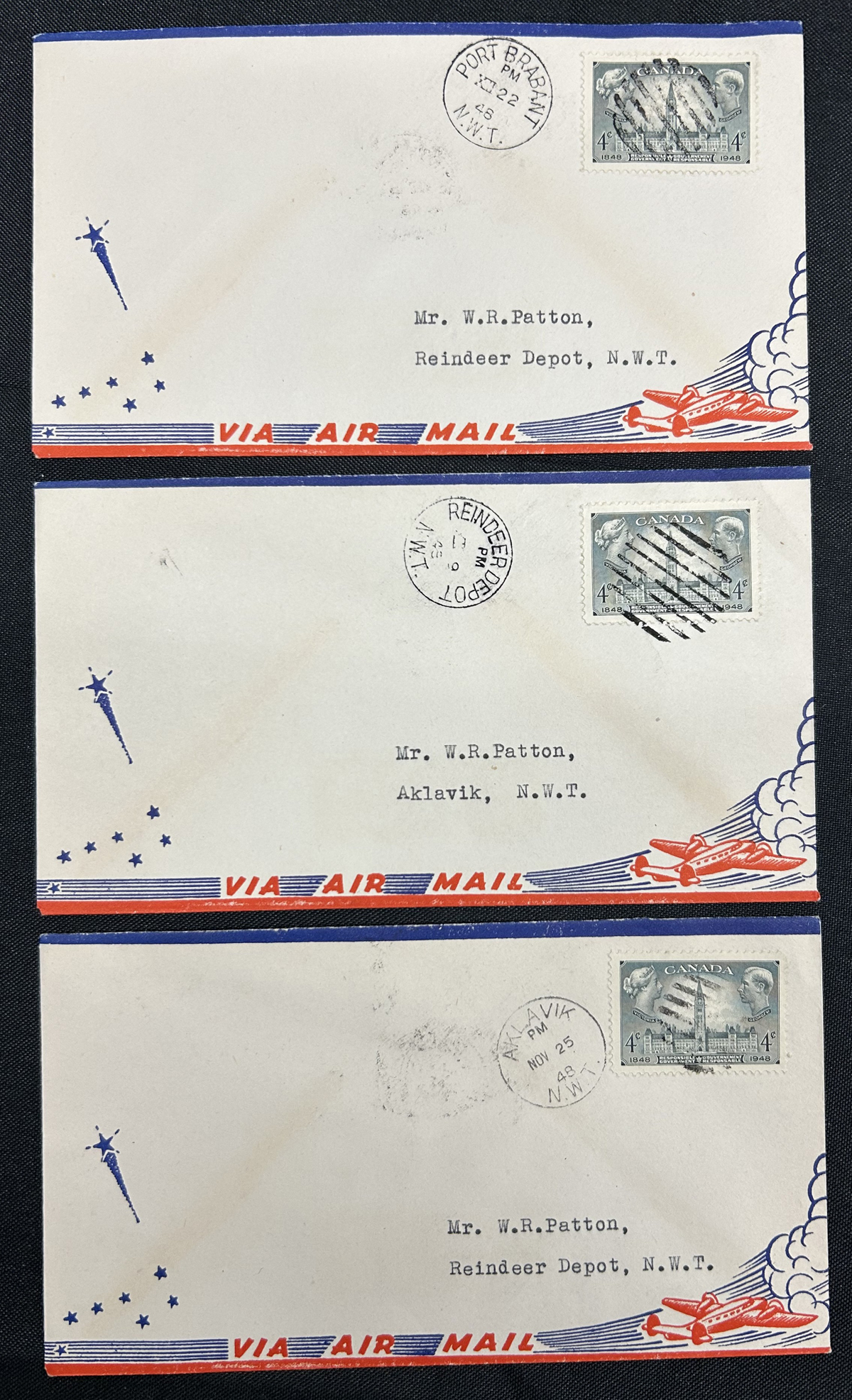 330 CVR   imageGroup of Three Northwest Territories Covers, all three are illustrated airmail envelopes mailed in 1948 with a 4c grey Responsible Government stamp. Includes Port Brabant to Reindeer Depot, Reindeer Depot to Aklavik and Aklavik to Reindeer Depot, all with despatch and receiver c.d.s. postmarks, very fine. (Scan 1) (Scan 2) (All Scans) (All Images)