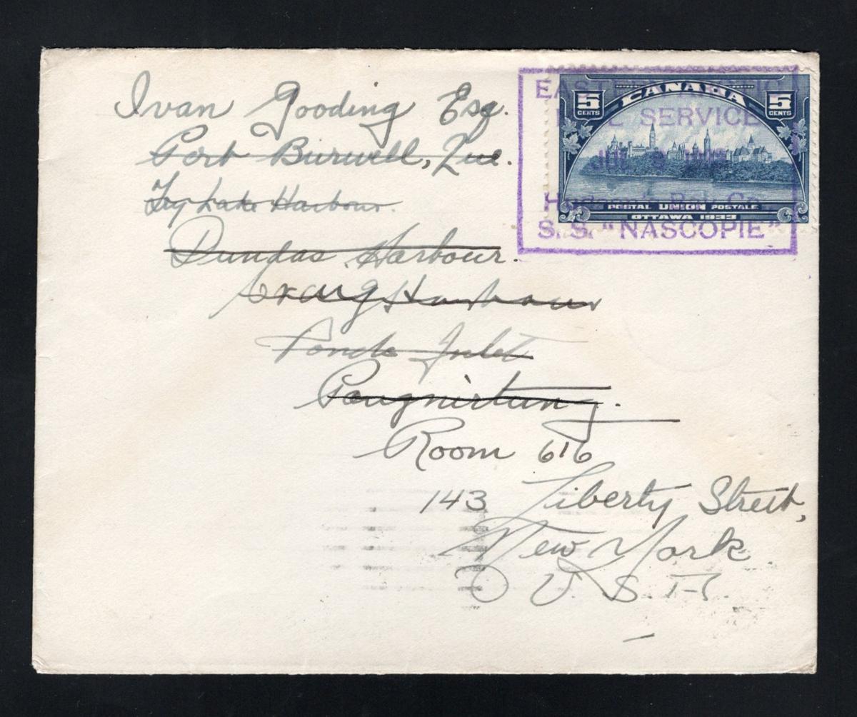 336 CVR   image1933 S.S. Nascopie Cover, a Royal Canadian Mounted Police cover (embossed back flap) with postmarks from Port Burwell PQ (JUL.18), Lake Harbour NWT (JUL.22), Dundas Harbour NWT (SEP.1), Craig Harbour NWT (SEP.4), Ponds Inlet Baffin Island NT (SEP.9 in purple), Pangnirtung NWT (SEP.16) and St Johns NL (SEP.28). Also a boxed "Eastern Arctic / Mail Service / Hudson's Bay Co., / S.S. Nascopie" JUL.8 handstamp on front tying a 5c Postal Union Conference issue, plus another strike on back dated SEP.17. Very fine. (Scan 1) (Scan 2) (All Scans) (All Images)