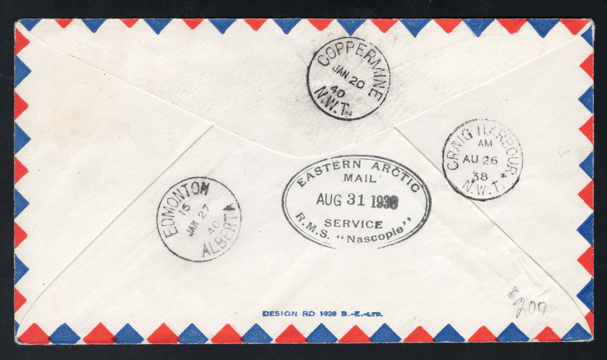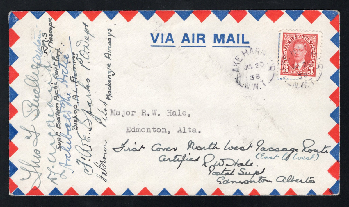 337 CVR   image1938-1940 Lake Harbour N.W.T. to Edmonton, 1st Northwest Passage (East to West) via R.M.S. Nascopie, mailed Lake Harbour on JUL.20.1938, to Craig Harbour (AUG.26.1938), then boarded the R.M.S. Nascopie on AUG.31.1938 (oval datestamp) to Coppermine (JAN.20.1940) then Edmonton (JAN.27.1940). The cover is signed by 6 officials, also certified by R.W. Hale, Postal Supervisor / Edmonton as being the "First cover North West Passage Route (East to West)". Quite a well-travelled cover, very fine and rare. (Scan 1) (Scan 2) (All Scans) (All Images)