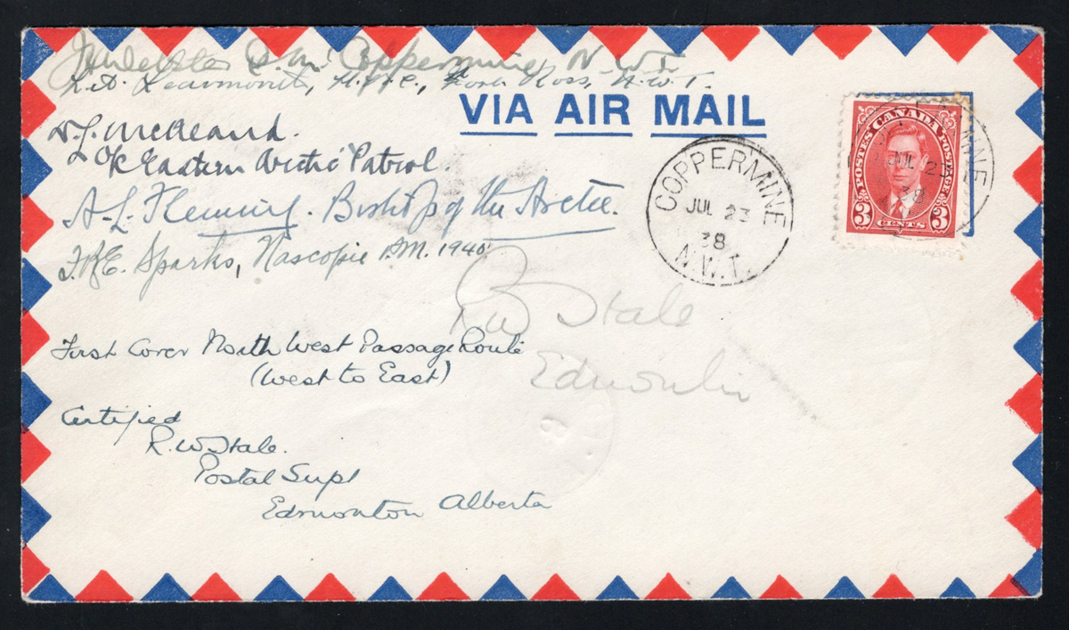 338 CVR   image1938-1940 Coppermine to Edmonton, 1st Northwest Passage (West to East) via R.M.S. Nascopie, mailed Coppermine on JUL.23.1938, with SEP.12.1940 R.M.S. Nascopie oval handstamp, through Fort Ross (SEP.12, first day of use), Ivigtut Greenland (OCT.4), and Edmonton (OCT.17). The cover is signed by 6 officials, also certified by R.W. Hale, Postal Supervisor / Edmonton as being the "First cover North West Passage Route (West to East)". Quite a well-travelled cover, very fine and scarce. (Scan 1) (Scan 2) (All Scans) (All Images)