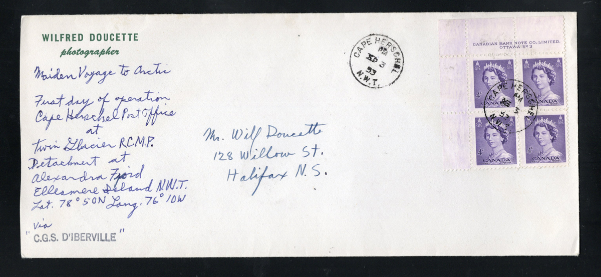339 CVR   image1953 First Day of Operation of the Cape Hershel Post Office, a legal size cover mailed Cape Hershel N.W.T. on SEP.3.1953 to Wilfred Doucette (photographer) in Halifax, with an "Eastern Arctic Patrol R.M.S. / Canada SEP.3.1953" c.d.s. backstamp. Front of cover explains the event and the route "via C.G.S. D'Iberville", very fine.