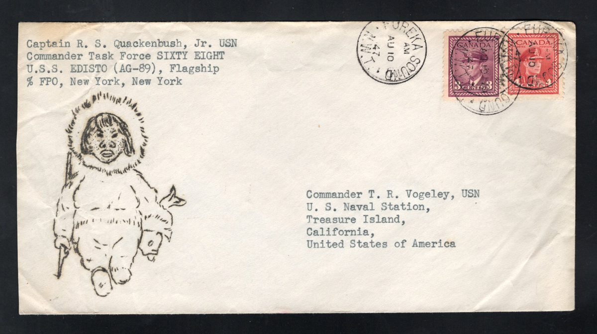 340 CVR   image1947 Eureka Sound First Day of Operation Cover to California, mailed Eureka Sound N.W.T. on AUG.10.1947 (four c.d.s. strikes to a U.S. Naval Station in California. The cover has an illustration of an Inuit holding a harpoon and a fish and has a New York return address. Very fine and scarce, this postmark having only been used for three months.