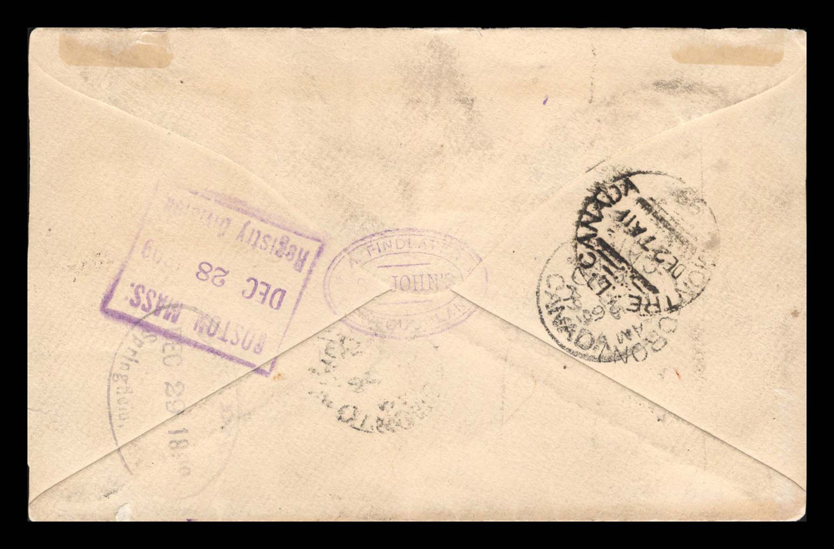 322 CVR 78/85 image1899 E.R. Krippner Hand Illustrated Registered Cover to Toronto, Forwarded to the USA, mailed on a R.P.O. on DEC.21.1899 to Toronto (DEC.26.1899 receiver) then re-directed to Springfield Massachusetts (DEC.29 receiver) via Montréal (DEC.27 squared circle precursor) and Boston (boxed transit). A nicely illustrated cover franked with five different Royal Family issues (a few small faults as the crayon cancel was removed), captioned “Our Royal Family”. Fine and ex Motson. (Scan 1) (Scan 2) (All Scans) (All Images)