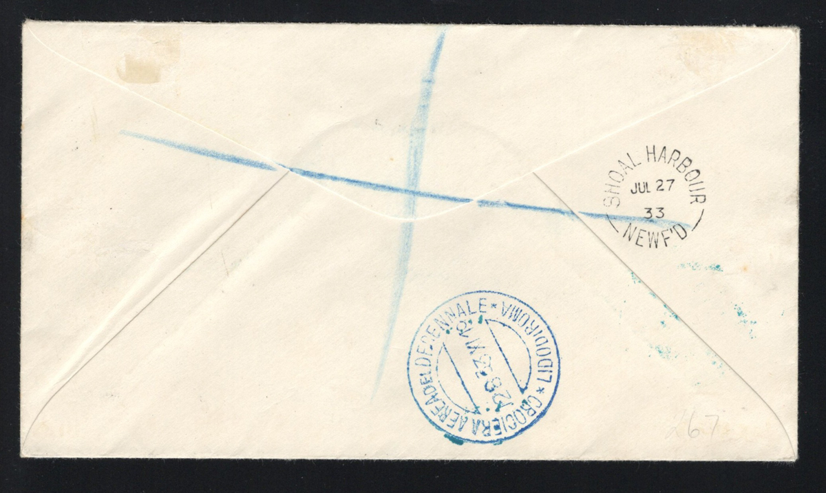 329 CVR C18 image1933 $4.50 on 75c Bistro on General Balbo Flight Cover, mailed from St. John’s Newfoundland on JUL.26.1933 (c.d.s. ties tamp) and addressed to "London, England, via Rome, Italy” via Shoal Harbour NL (JUL.27.1933 transit on back) and JUL.28.1933 Rome special flight receiver on back. The cover is franked with Scott #C18, the General Balbo Flight overprinted issue, and there is a flight cachet on front in blue-green. A very fine example of this popular flight cover. (Scan 1) (Scan 2) (All Scans) (All Images)