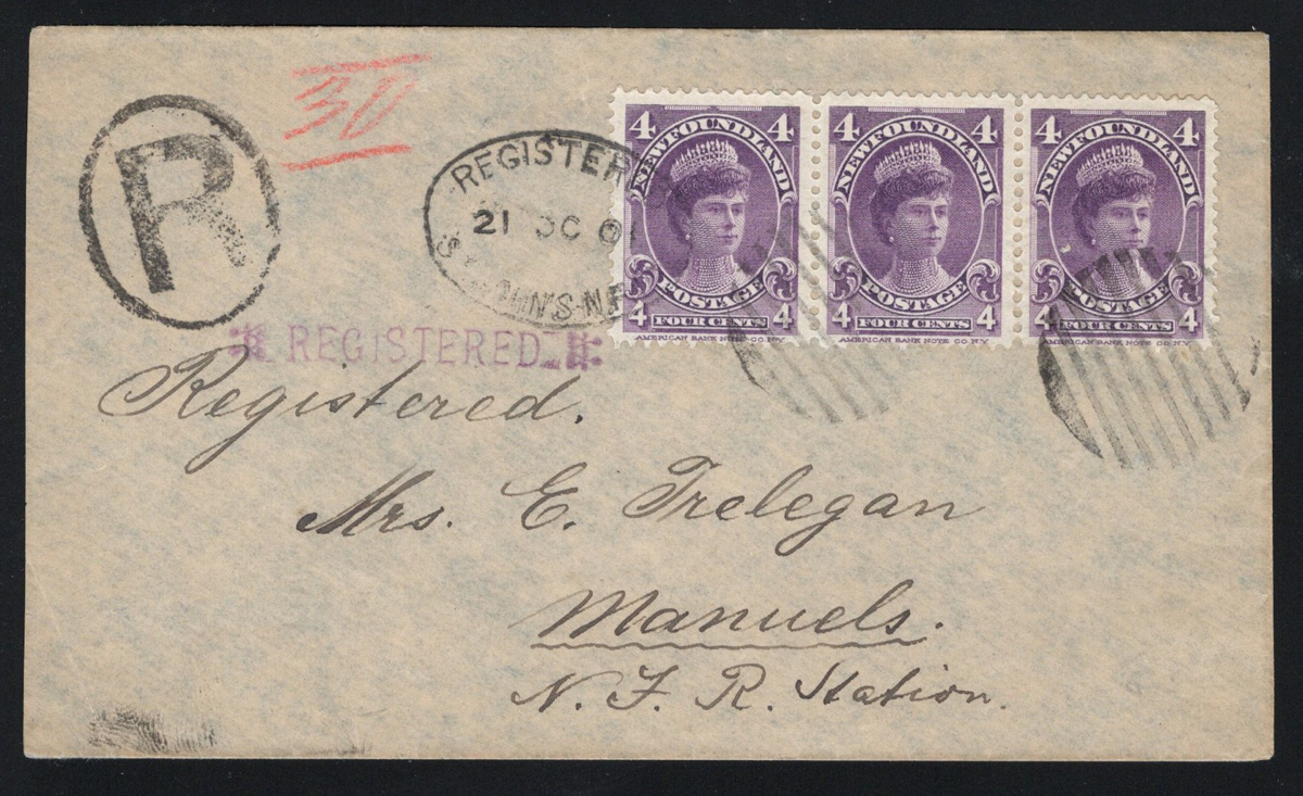 324 CVR 84 image1901 (October.21) Registered First Day Cover, mailed from St. John’s to Manuels, franked with a strip of there of the 4c Violet Queen Mary issue (paying the triple weight, registered rate), mailed on its first day of use, very fine and quite rare.