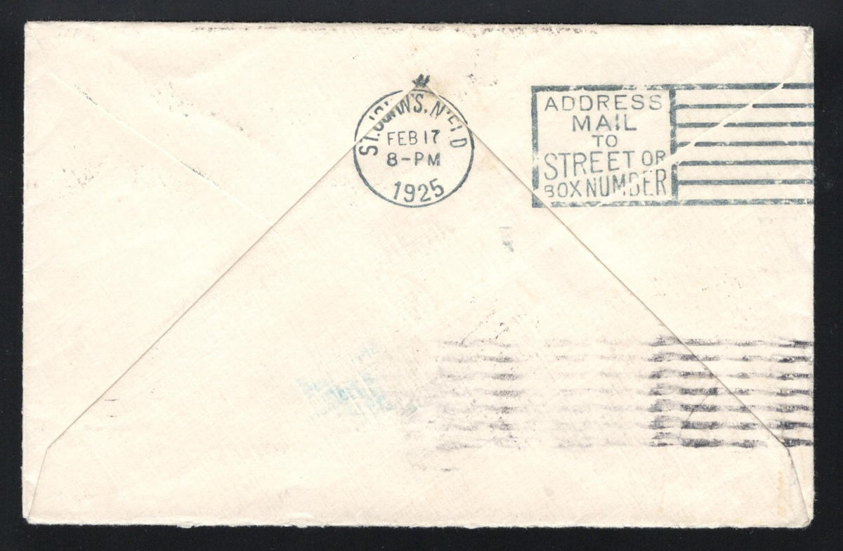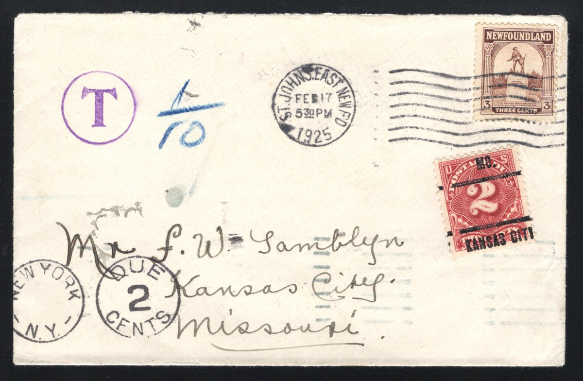 326 CVR 133 image1925 Postage Due Cover to the United States, with Postage Due Stamp, mailed St. John’s East on FEB.17.1925 (wavy-line machine on front, and Slogan machine on back) to Kansas City, Missouri. The cover is franked with a 3c brown War Memorial issue and is rated “DUE 2 CENTS" (New York duplex rated double 1c deficiency) with a 2c Kansas City precancelled Postage Due stamp applied, very fine. (Scan 1) (Scan 2) (All Scans) (All Images)