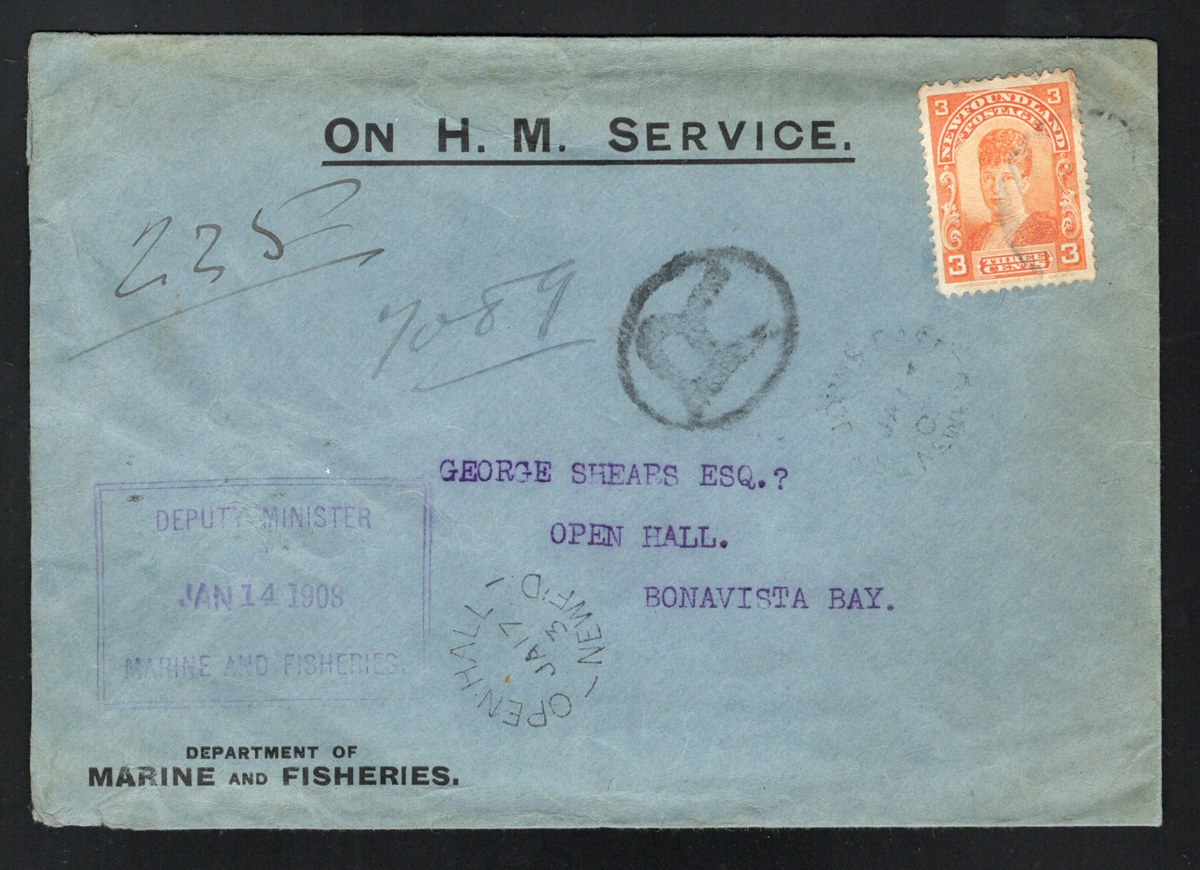 323 CVR 83 image1903 O.H.M.S. Postage Free Registered Domestic Cover, an O.H.M.S. Marines and Fisheries envelope mailed from St John’s East on JAN.14.1909 (faint despatch, with date verified by the boxed “Deputy Minister” datestamp) to Open Hall, Bonavista Bay (JAN.17.1903 broken circle receiver). This registered cover could be sent free, and thus is franked with a 3c orange Queen Alexandra stamp, paying the registration fee only. The back shows an interesting S.D. Grant stamp dealer caribou handstamp. Very fine, and an elusive franking situation. (Scan 1) (Scan 2) (All Scans) (All Images)