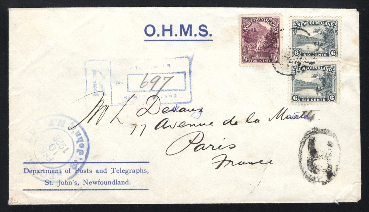 328 CVR 134, 136 image1928 O.H.M.S. Registered Cover to France, an O.H.M.S. Department of Posts and Telegraphs cover mailed from St. John’s on FEB.10.1928 (double circle registration datestamp plus registration number box) to Paris, France, via London (FEB.27.1928 “hooded” registration transit in red), franked with a 4c brown violet Humber River and two 6c grey black Upper Steadies issues paying the 6c postage plus 10c registration fee. Tear on back, ending lower right corner, else fine. (Scan 1) (Scan 2) (All Scans) (All Images)