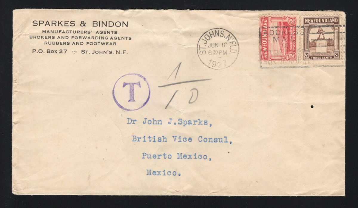 325 CVR 132, 133 image1927 Shortpaid Cover to Mexico, a Sparkes & Bindon corner card cover mailed from St. John’s on JUN.18.1927 (slogan machine) to the British Vice Consul in Puerto Mexico (JUN.30 receiver) via Veracruz (JUN.29 transit), franked with a 2c carmine South West Arm and a 3c brown War Memorial which is a short payment of 1c, evidenced by a “T” in circle handstamp, plus a manuscript "1/10" in pencil. Overall light wrinkles, else fine. (Scan 1) (Scan 2) (All Scans) (All Images)