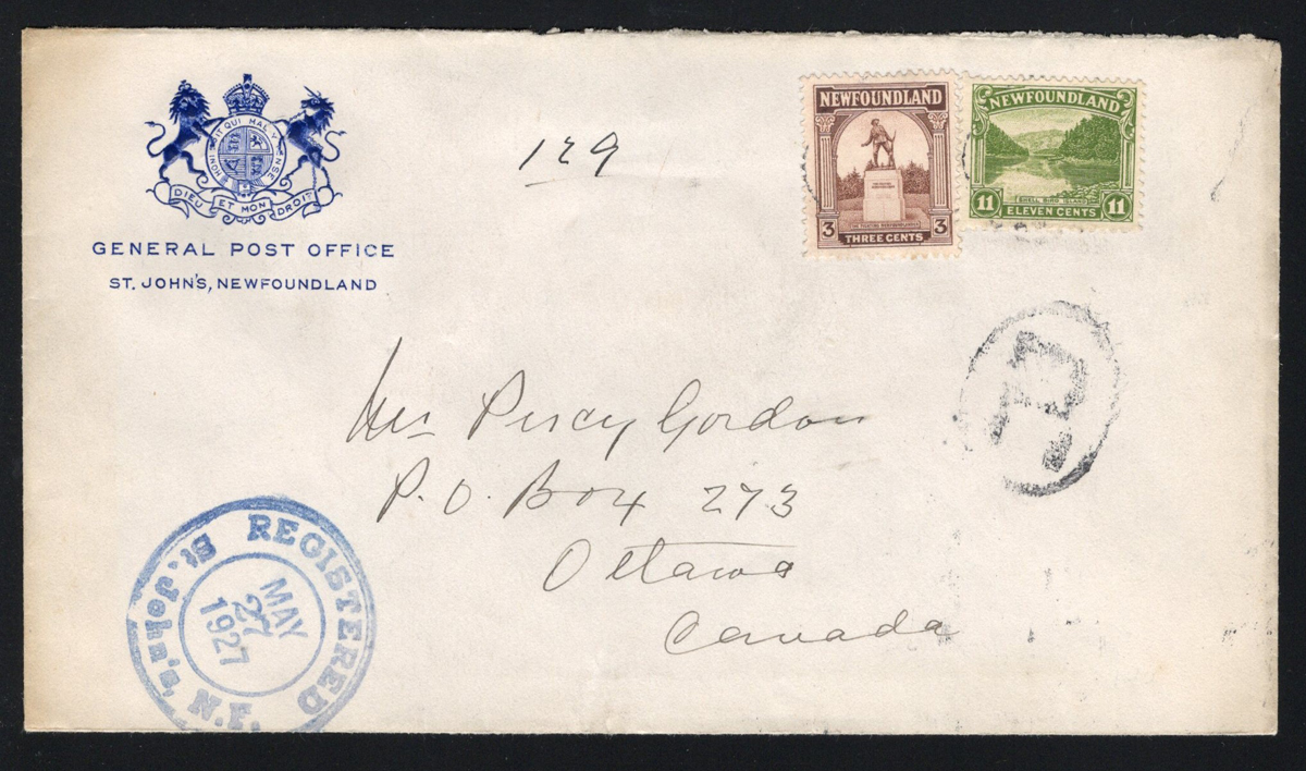 327 CVR 133, 140 image1927 Registered Cover to Ottawa, a General Post Office corner card cover mailed from St. John’s on MAY.27.1927 (double circle registration despatch) to Ottawa (JUN.3 receiver) via Montréal (JUN.2 transit), franked with a 3c brown War Memorial and an 11c olive green Shell Bird Island. A very fine cover with a better franking. (Scan 1) (Scan 2) (All Scans) (All Images)