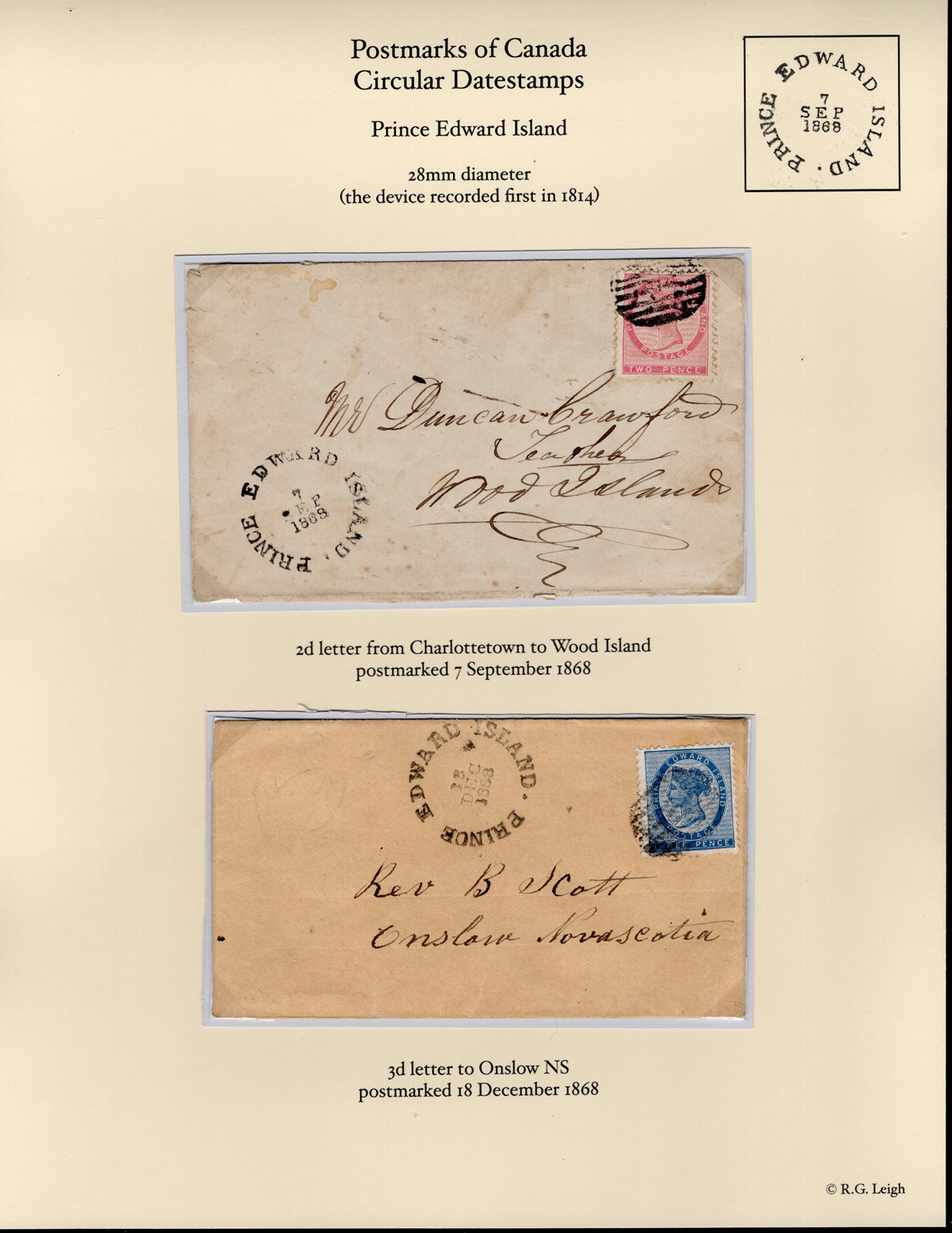 343 CVR   imageTwo 1868 Prince Edward Island Covers, first was mailed SEP.7.1868 to Wood Island, franked with a 2d rose adhesive, second was mailed DEC.18.1868 to Onslow, N.S., through Halifax (DEC.23) and Truro (DEC.24), franked with a 3d blue adhesive. Both fine-very fine and better than are normally seen.