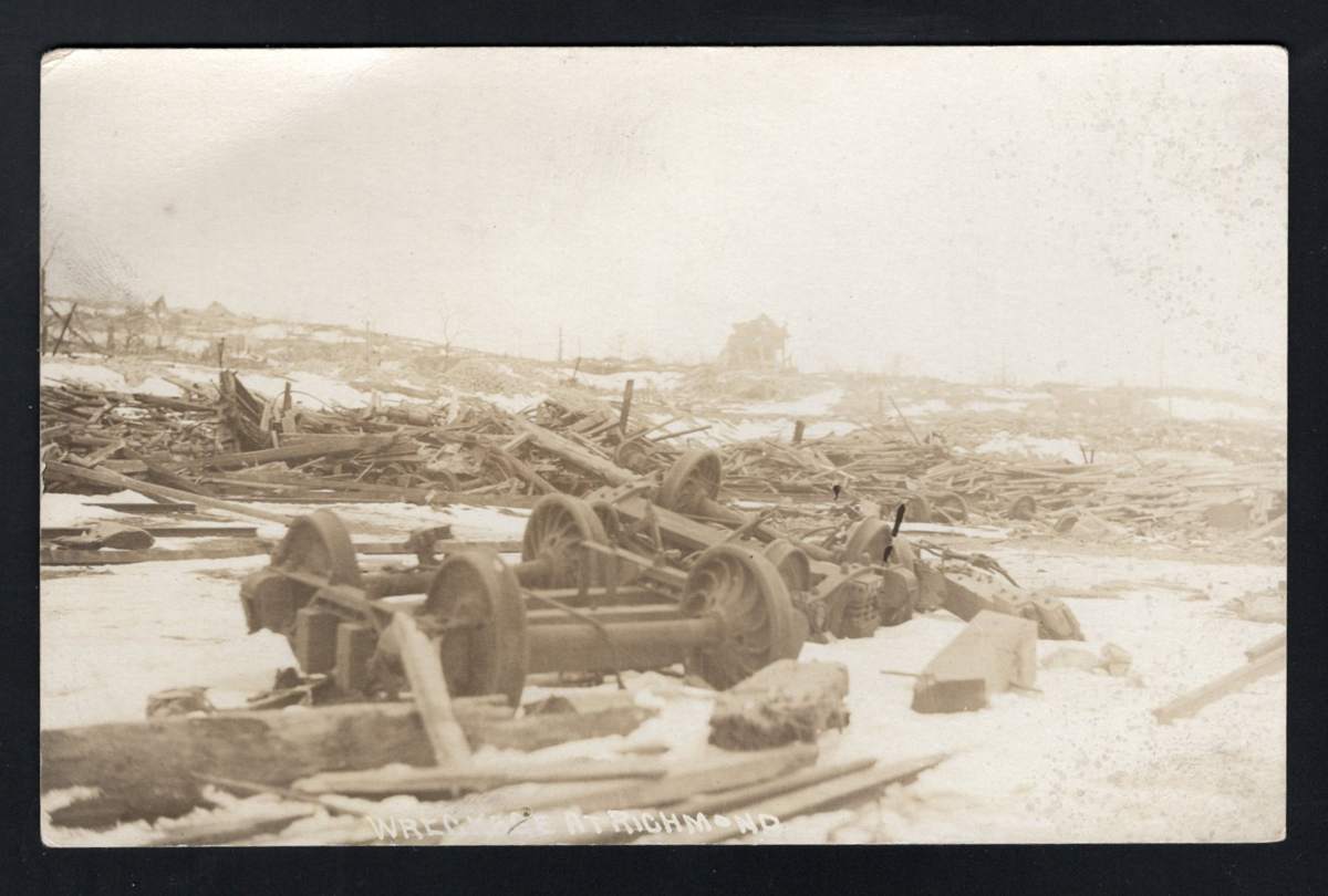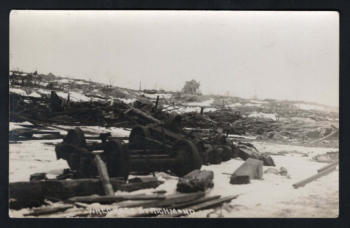 355 PC   imageca. 1917 Real Photo Postcard of the Halifax Ship Disaster, a written, but unmailed photo card depicting twisted and burnt railways ties and train wheel assemblies in the snow, with the notation "Wreckage at Richmond", very fine. On the morning of 6 December 1917, the French cargo ship SS Mont-Blanc collided with the Norwegian vessel SS Imo in the Halifax, Nova Scotia harbour. The Mont-Blanc, laden with high explosives, caught fire and detonated, devastating the Richmond district of Halifax. (Scan 1) (Scan 2) (All Scans) (All Images)