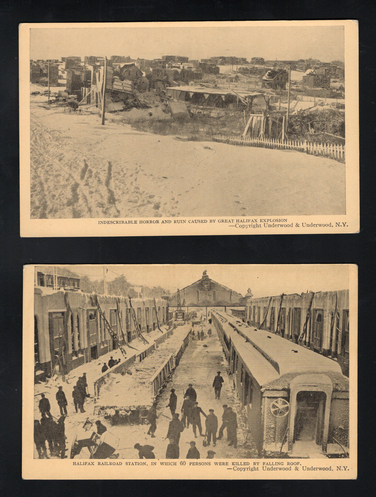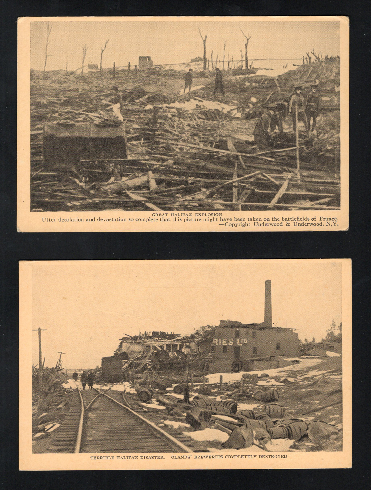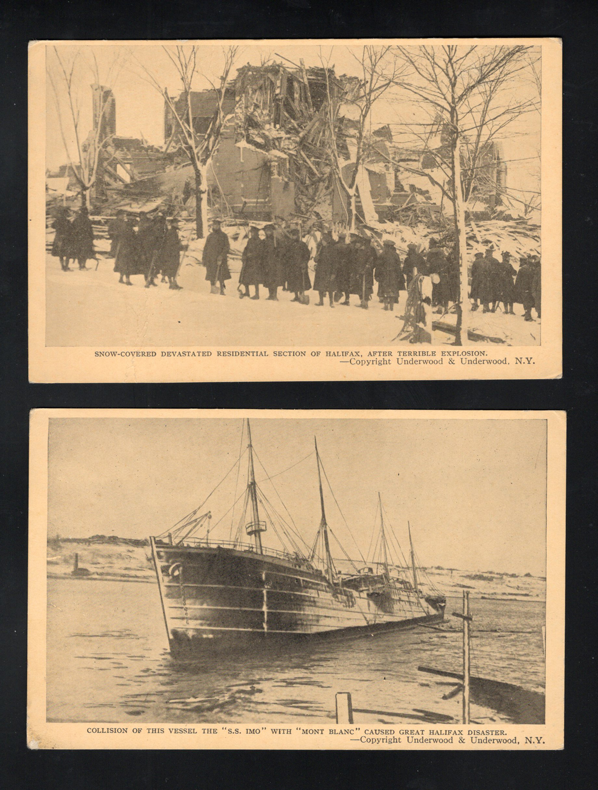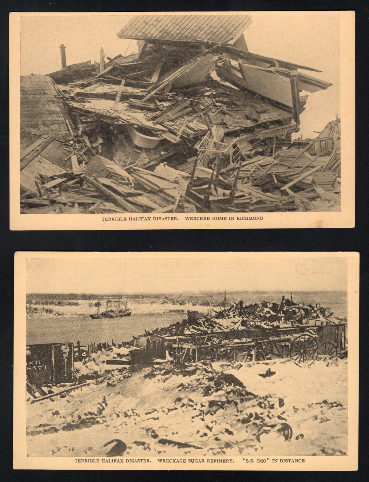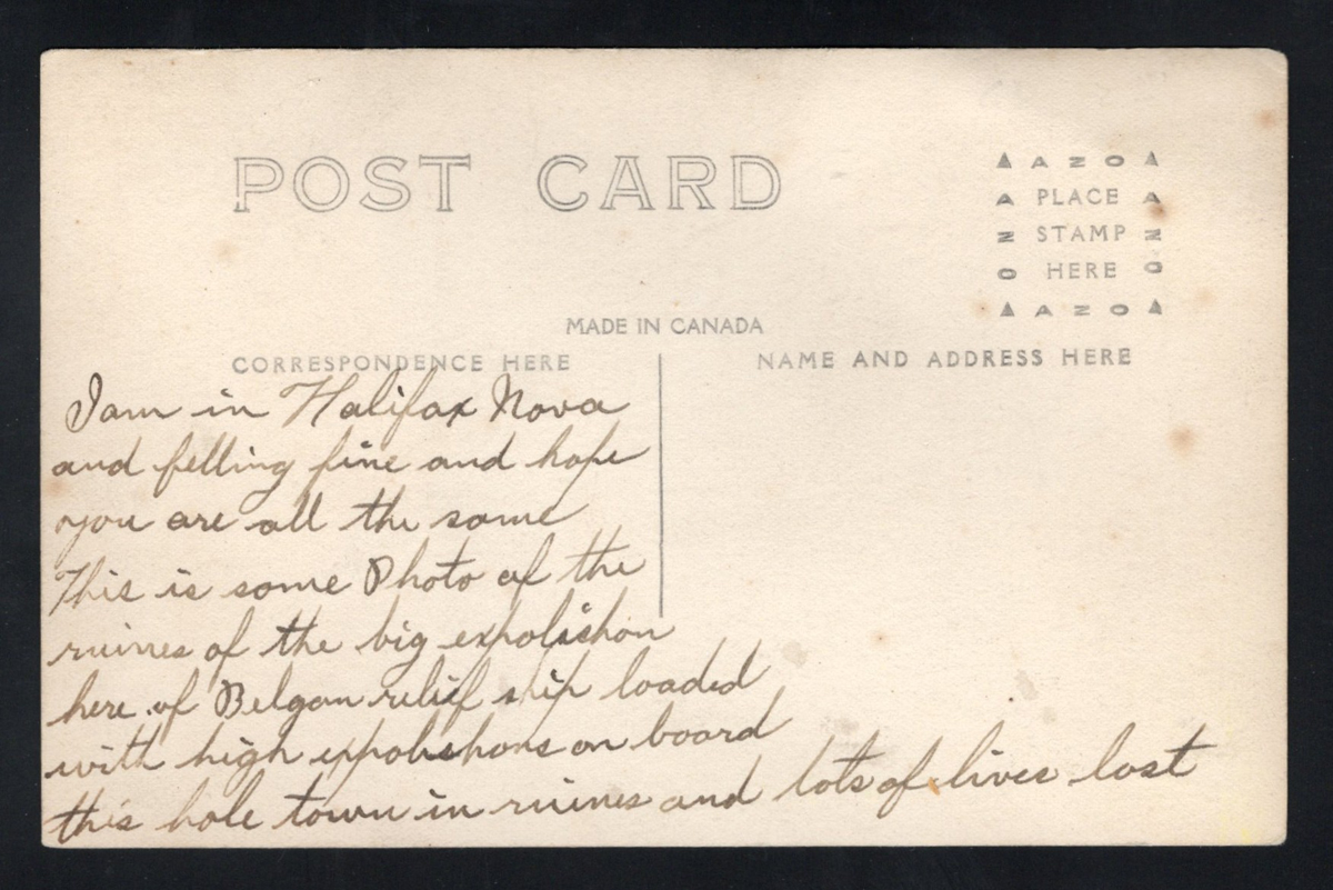 354 PC   imageca. 1917 Real Photo Postcard of the Halifax Ship Disaster, an unused photo card depicting twisted and burnt railway ties and train wheel assemblies in the snow, very fine. On the morning of 6 December 1917, the French cargo ship SS Mont-Blanc collided with the Norwegian vessel SS Imo in the Halifax, Nova Scotia harbour. The Mont-Blanc, laden with high explosives, caught fire and detonated, devastating the Richmond district of Halifax.
