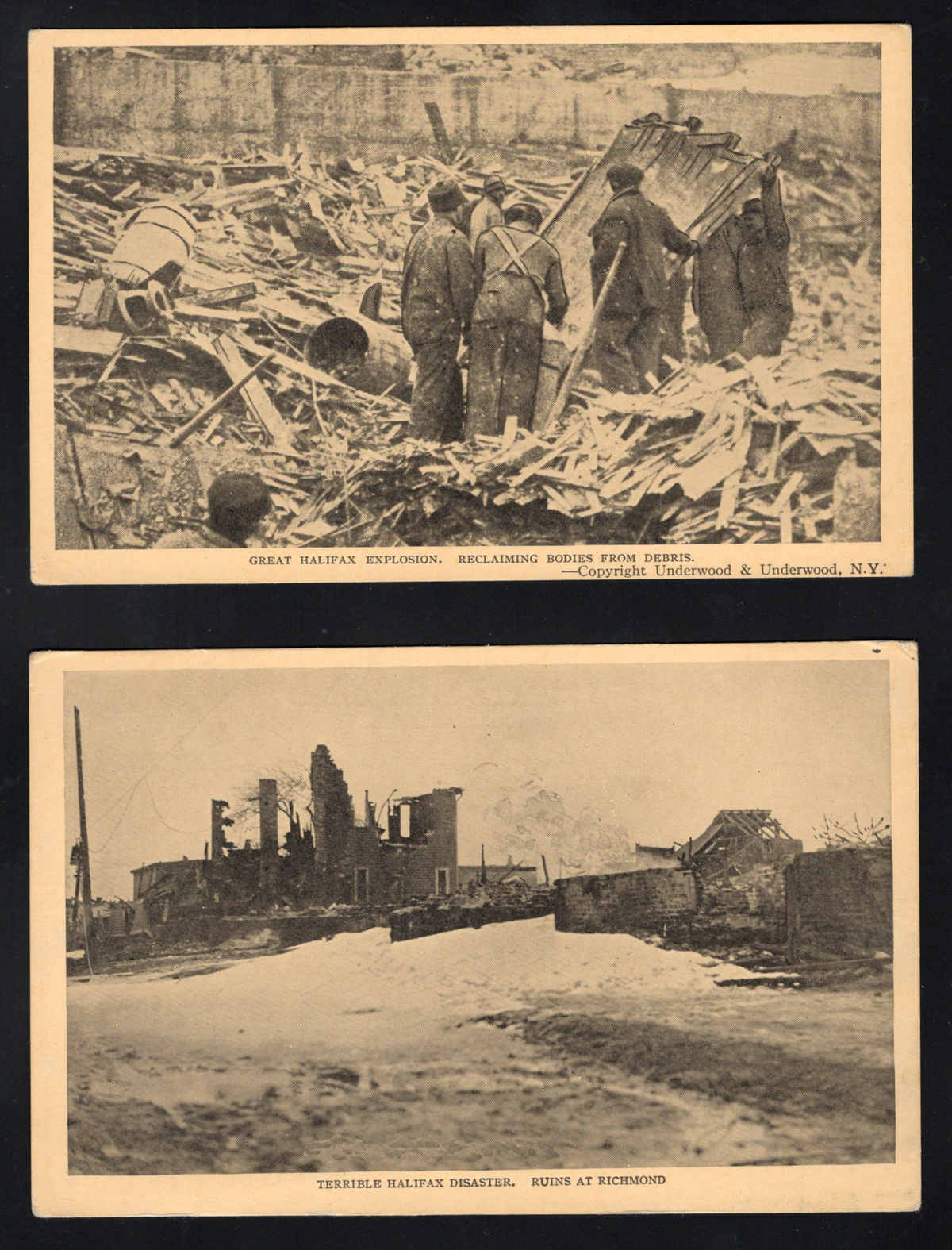 356 PC   imageca. 1917 Set of 10 Different Picture Postcards of the Halifax Ship Disaster, all unused and depicting various aftermath scenes following the explosion. Each has a caption at bottom, and were printed by the "Novelty Mfg. & Art Co. Limited, Montreal", very fine. On the morning of 6 December 1917, the French cargo ship SS Mont-Blanc collided with the Norwegian vessel SS Imo in the Halifax, Nova Scotia harbour. The Mont-Blanc, laden with high explosives, caught fire and detonated, devastating the Richmond district of Halifax. (Scan 1) (Scan 2) (Scan 3) (Scan 4) (Scan 5) (All Scans) (All Images)