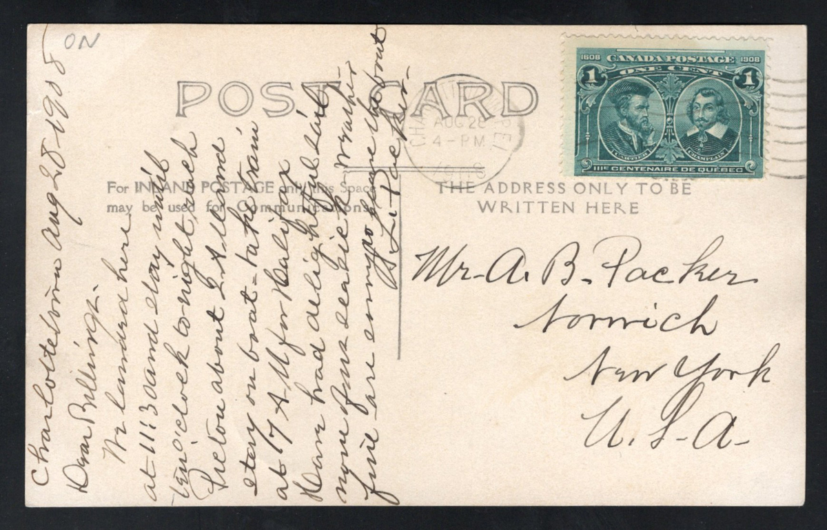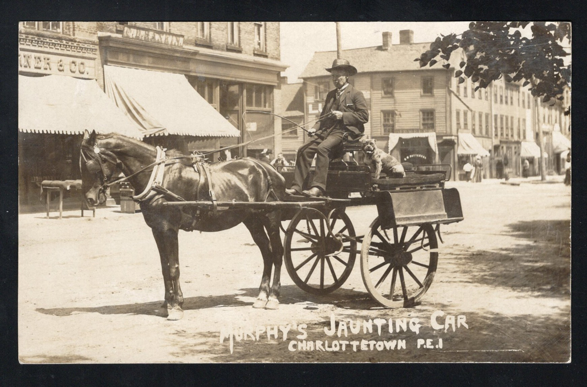 344 PC   image1908 Real Photo Postcard from Prince Edward Island, written and mailed from Charlottetown on AU.28.1908 to New York City, franked with a 1c green Québec Tercentenary issue. The photo depicts a lovely scene showing a "Murphy's Jaunting Car" in front of some Charlottetown storefronts. Very fine and rare. (Scan 1) (Scan 2) (All Scans) (All Images)
