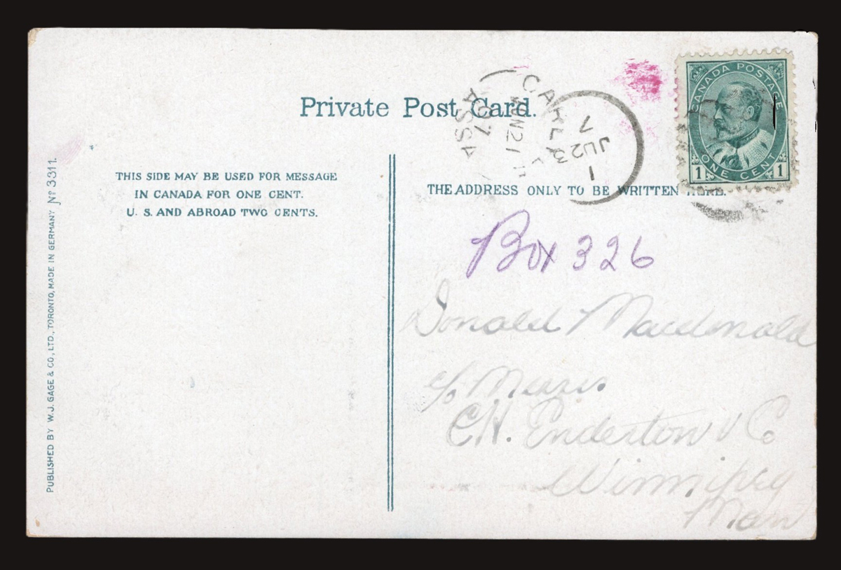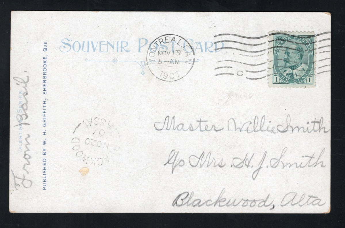 345 PC   image1907 Blackwood ASSA Postmark on Picture Postcard, a fine receiver strike dated NOV.20.1907 on a postcard mailed from Montréal (NOV.19 machine despatch). Emerging Saskatchewan reports only 9 examples known of this first broken circle, RF E. (Scan 1) (Scan 2) (All Scans) (All Images)